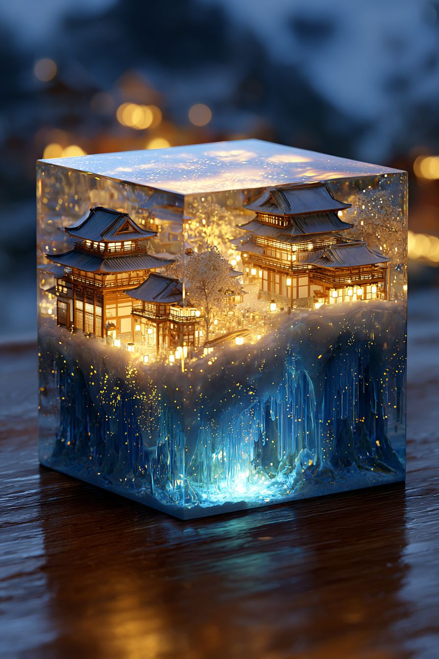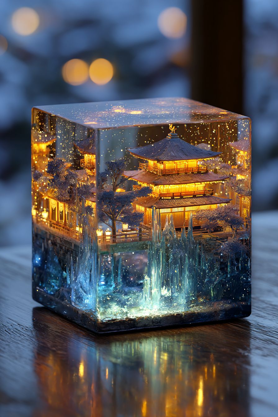 Запечатанный стеклянный куб содержит два прекрасно разделенных мира: древние японские храмы наверху и сверкающий ледяной кристальный город внизу