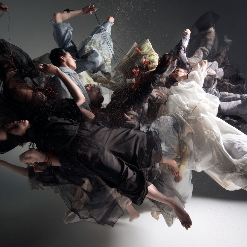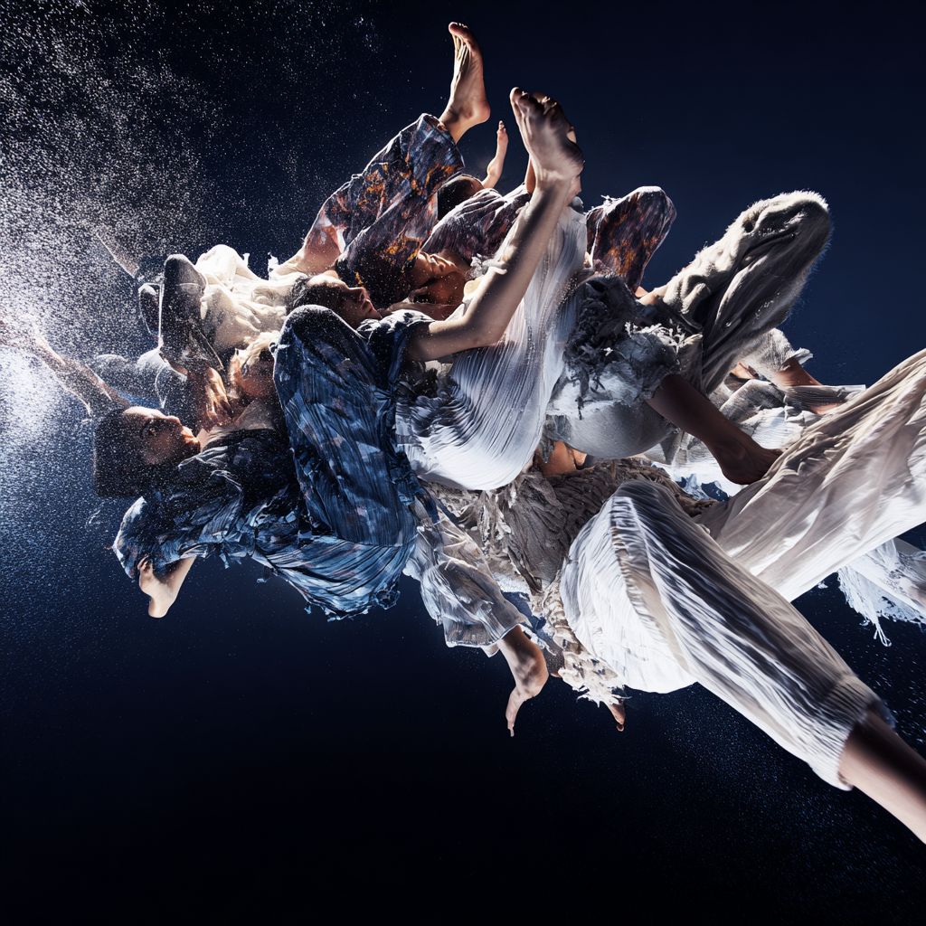 Editorial fashion-style contemporary art wide angle image of a dreamy group of young adult floating up in the air in a photo shoot studio. they are massed on each other creating a human sculpture in the middle of the room. zero gravity. attracted and repelled. Dynamic. Performing art. Dancing. They wear relaxed, contemporary art fashion look: over sized clothes. Luxury materials. Cotton, wool, fibers, nylon, linen, translucent. Fabric patterns. Strings. Fringes. Editorial, hyper-realistic composition. Detailed skin. Skin imperfections. mirco particles of dust and shiny sand burst in the air. Captured with a long compressed focal length on a vintage fujifilm camera. film grain. clean and polished. --raw --profile pkypm9h --stylize 0 --v 7.0