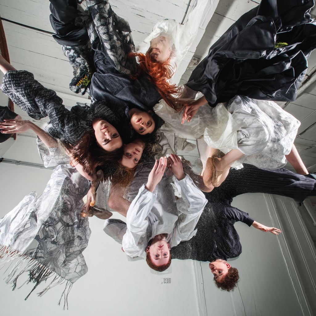 Группа молодых людей в расслабленной моде парит в воздухе, создавая человеческую скульптуру