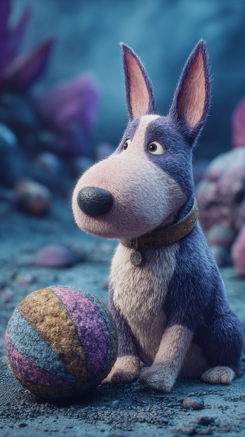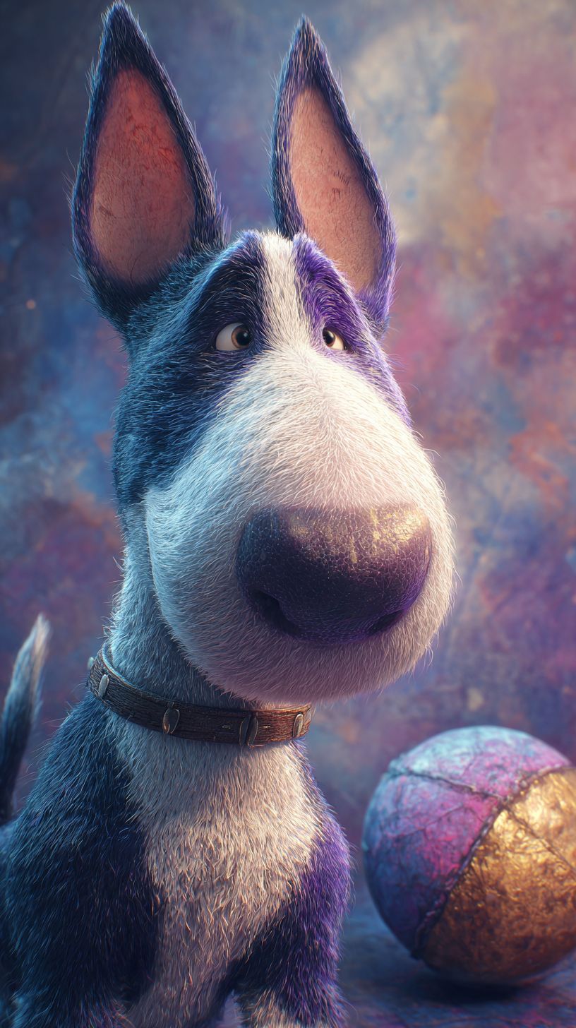 Мультфильм Pixar с невероятно милым и причудливым щенком бультерьера с exaggerated-скетчевыми чертами, хитрым выражением и яркой шерстью в пастельных тонах фиолетовых, синих и золотых акцентов, играющим с большим шаром, с элементами темной фантазии, как будто застывшим в моменте приключения в волшебном, мечтательном мире.