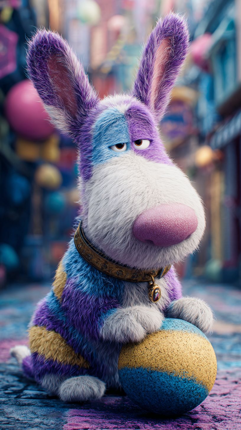 Pixar movie photo of an extremely cute whimsical Bullterrier-puppy with exaggerated, sketchy features, sly expression, and vibrant fur in pastel tones of purples, blues, and gold accents, playing with a big ball, with a touch of dark fantasy, as though caught mid-adventure in a magical, dreamlike world. --ar 9:16