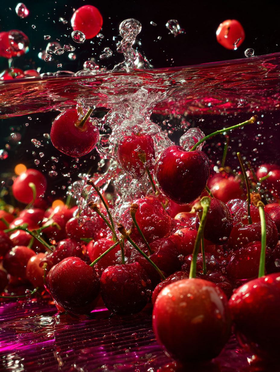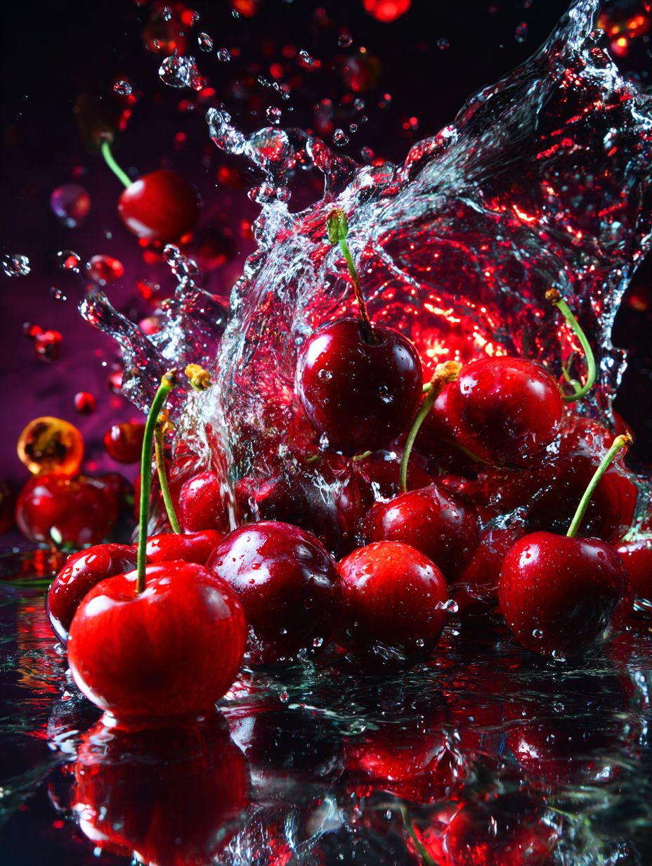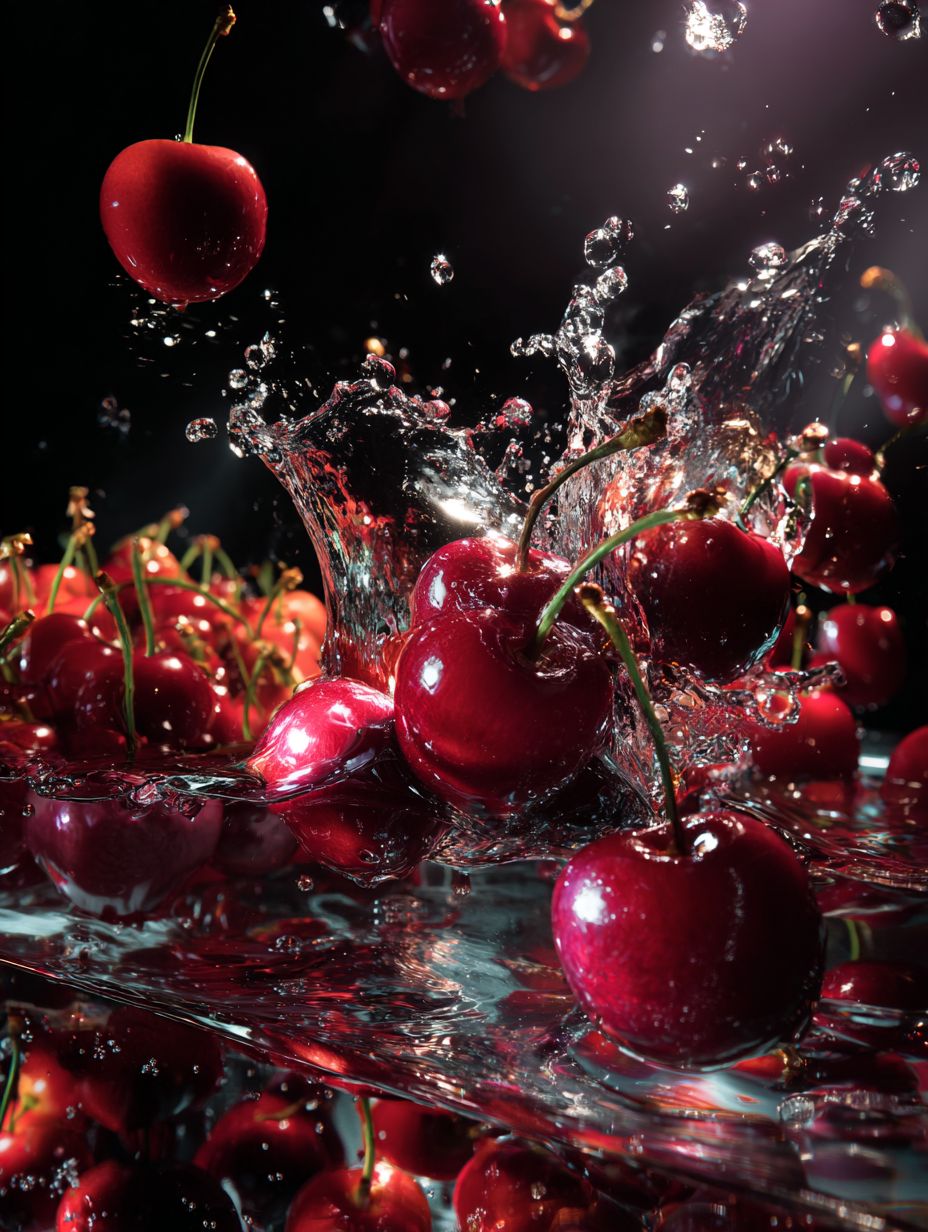 food photography, water splashing, fruit, food, no humans, many red cherries, food focus, dark red theme, dark red, dynamic motion, red cherry, water drop, depth of field, bubble, water, splashing --ar 3:4 --raw --v 7.0 --p 78soi4x --s 50