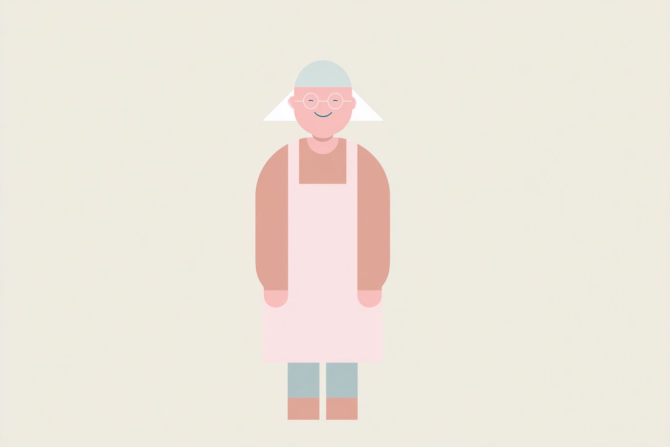 Иллюстрация в плоском дизайне улыбающейся бабушки в фартуке, представленная в минималистском стиле. На фоне простого светло-серого цвета произведение использует мягкую нейтральную палитру нежно-розового и белого цветов, с чистыми формами, сбалансированным пространством и простым геометрическим очарованием.