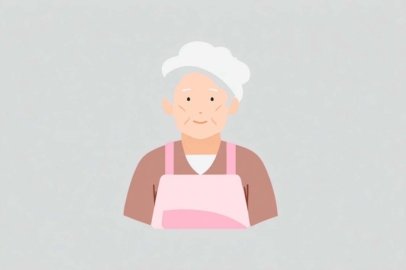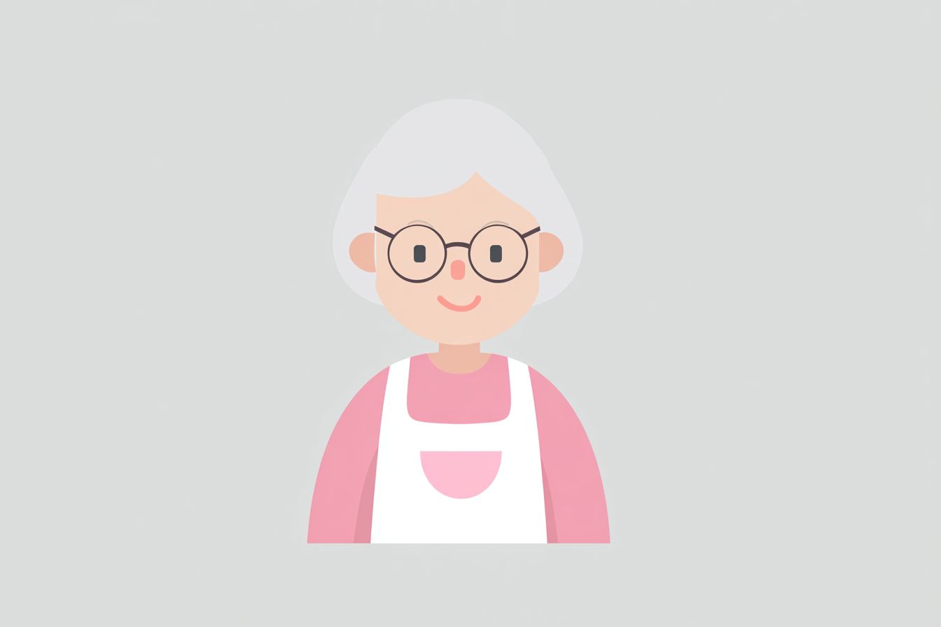 A flat design illustration of a smiling grandma in an apron, presented in a front-facing, minimalistic style. Set against a plain light gray background, the artwork uses a soft, neutral palette of soft pink and white, with clean shapes, balanced spacing, and simple geometric charm. --ar 3:2 --v 7.0 --p 78soi4x --s 50