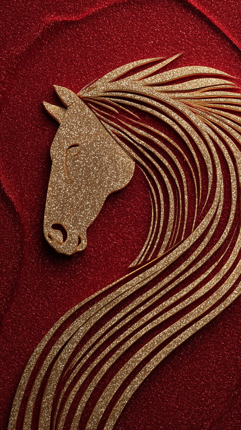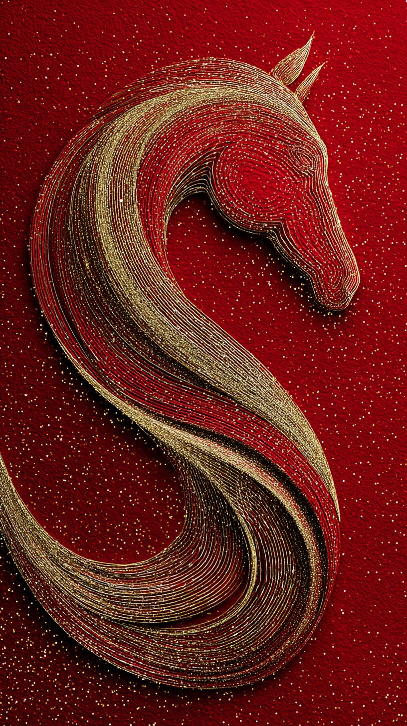 A horse's head and glittering silver lines forming the shape of an s-curve, against a red background with a golden glitter effect. the logo is presented in high definition, showcasing exquisite details and smooth curves. it showcases an elegant style that emphasizes luxury and modernity. in contrast to traditional chinese elements, it combines a gold texture and glimmer effects for visual impact, in the style of a modern, high-end fashion design. --ar 9:16 --raw --v 7.0