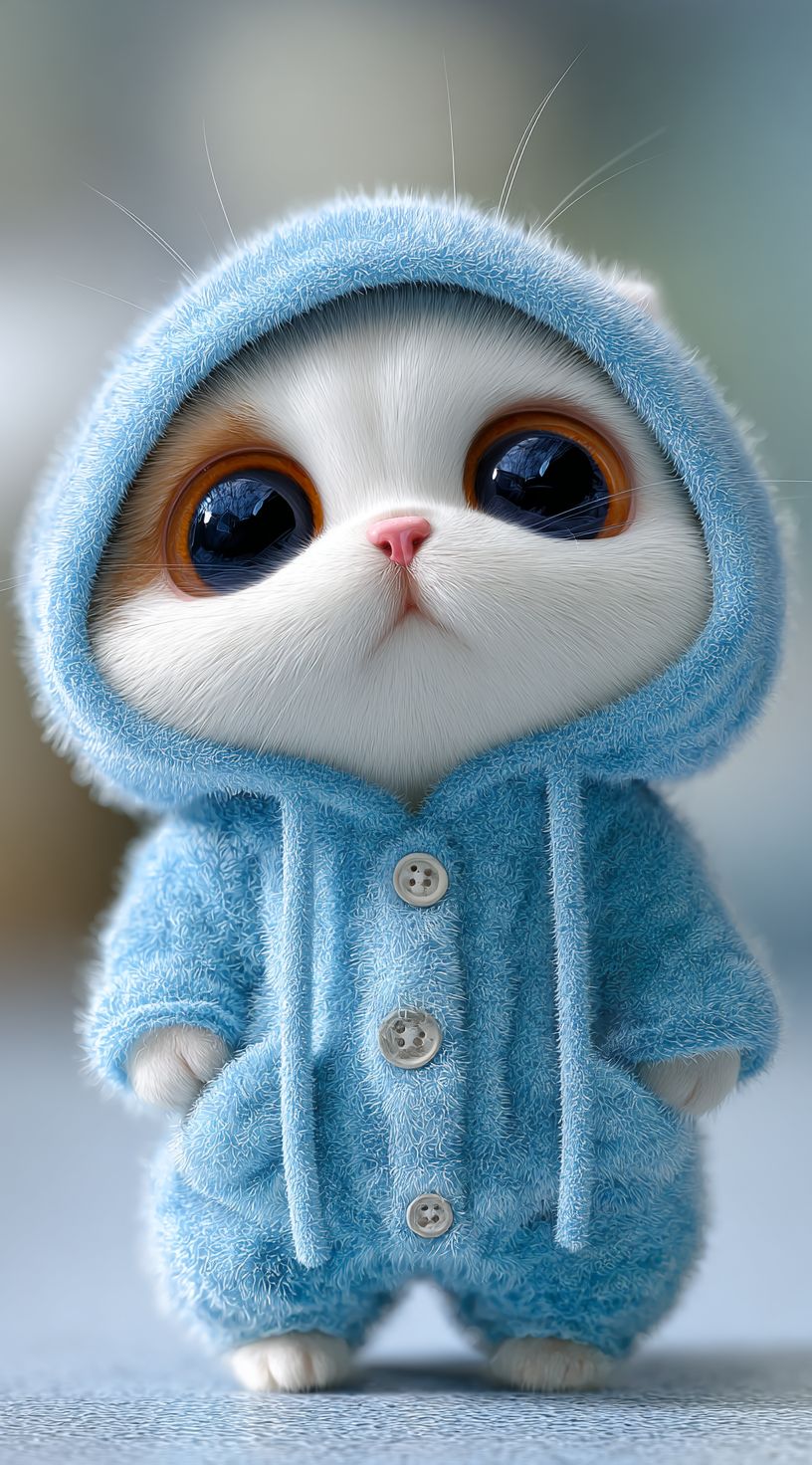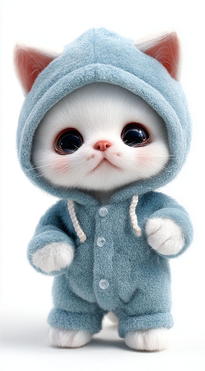 cute white cat, wearing blue hooded pajamas with eyes open and big round pupils, very cute style, plush doll-like art, cute expression, high-definition photography. --ar 71:128 --v 7.0