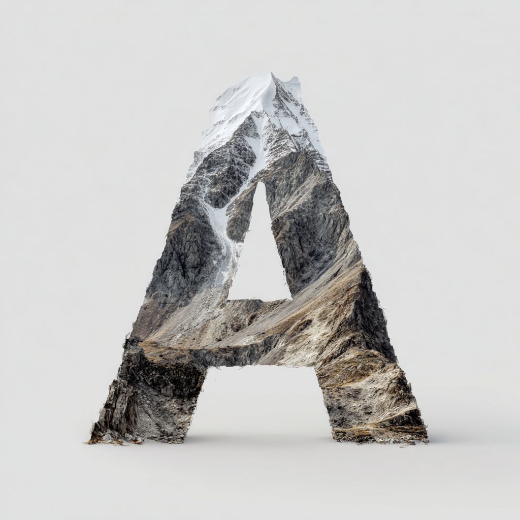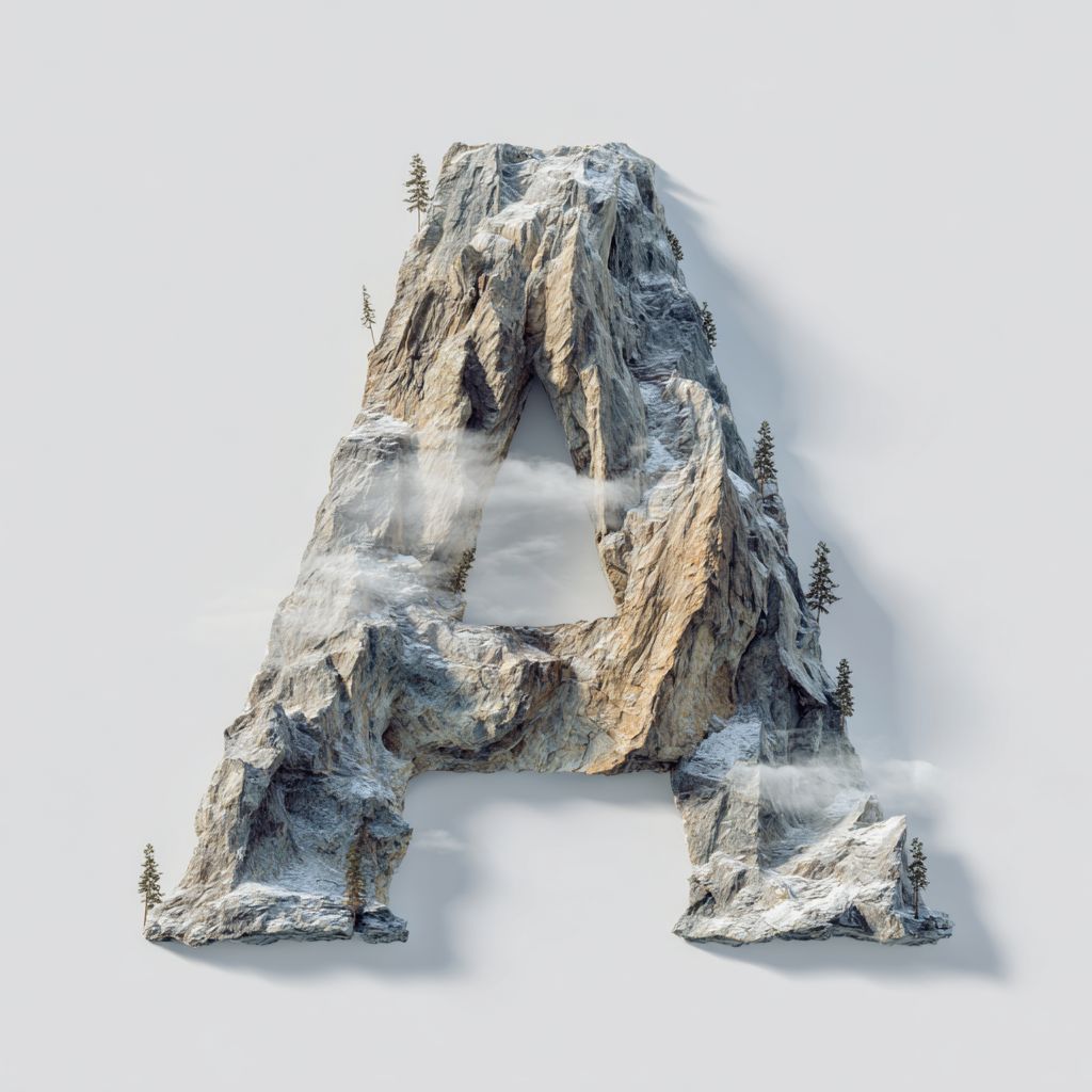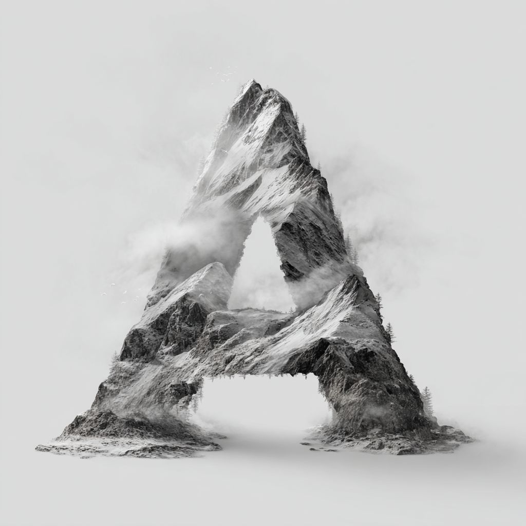 Буква 'A' состоит из скалистых гор, которые стоят в белой среде незавершенности.