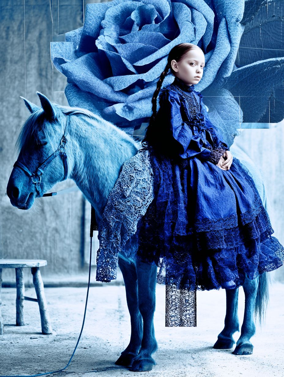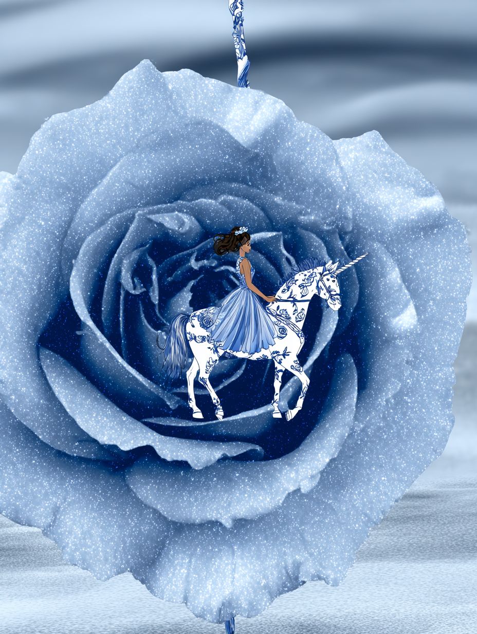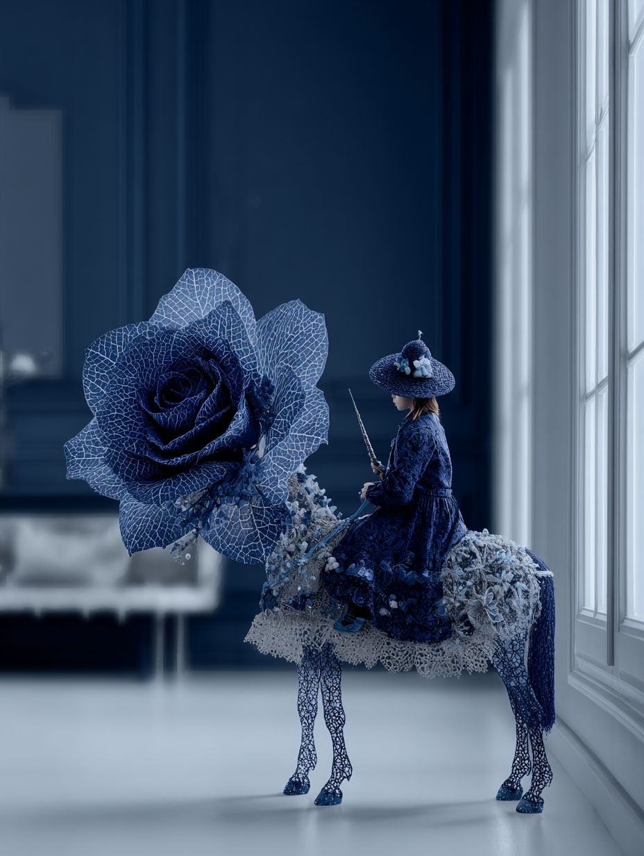 В центре красивой большой розы находится девочка в синем платье из 1800-х годов и красивый небесно-голубой единорог с прекрасным розовым декором и кружевной седелькой. Фон представляет собой минималистичный интерьер в темно-синем цвете из 1800-х, вдохновленный Вильгельмом Хаммерсхой. Сюрреалистическая атмосфера. Сдержанный, минималистичный, вечный, созерцательный и символичный дизайн, вдохновленный Вильгельмом Хаммерсхой.