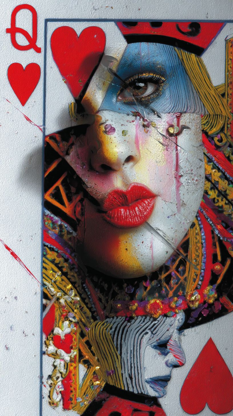 Безумно фотореалистичное фото журнала, кинематографическая карта королевы червей игральных карт. Сама карта 2D, 60-летняя красивая женщина, королева выходит из карты и посылает поцелуй. Экстремальная 3D-перспектива, очень красочное искусство. Яркие цвета.