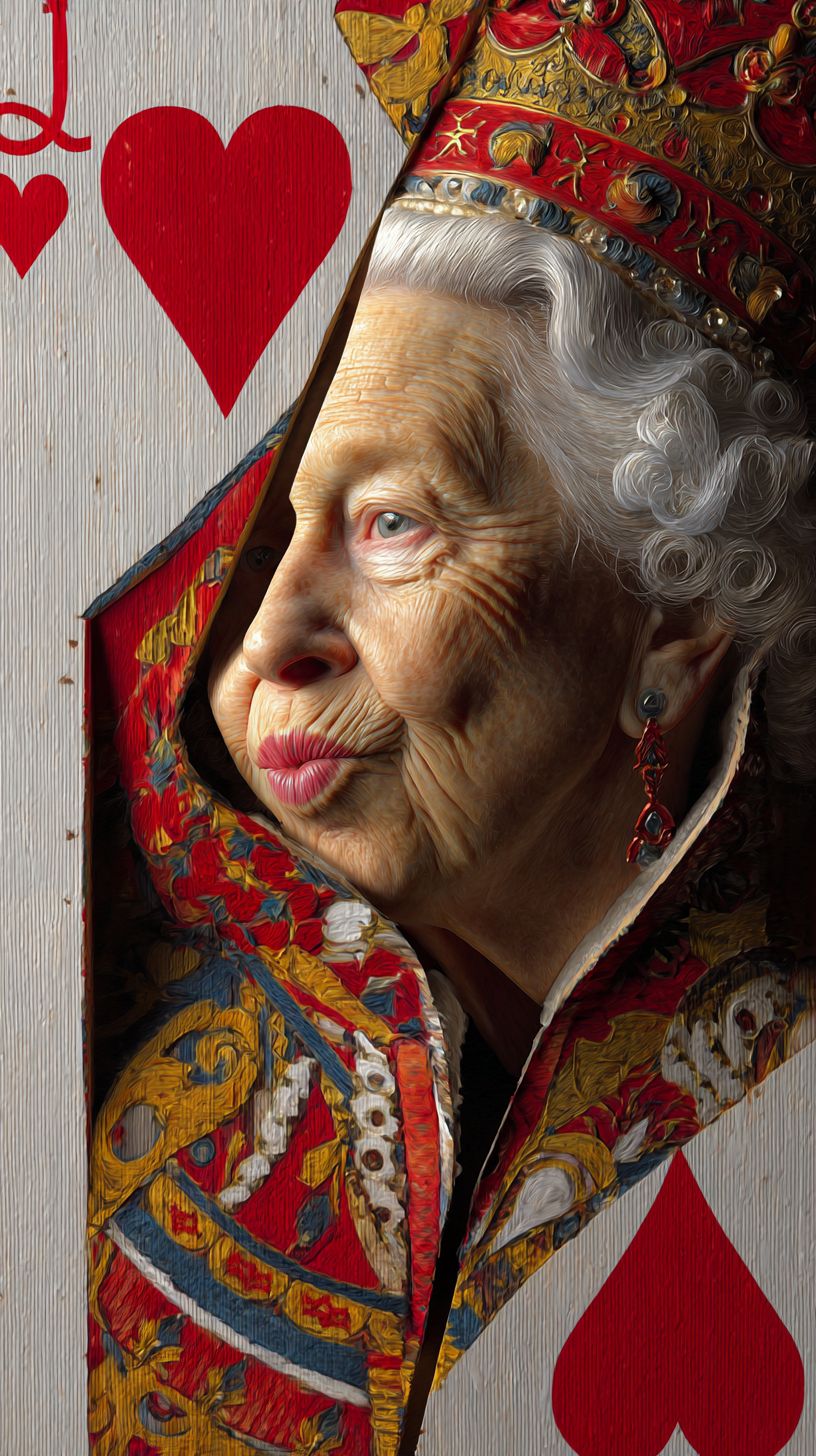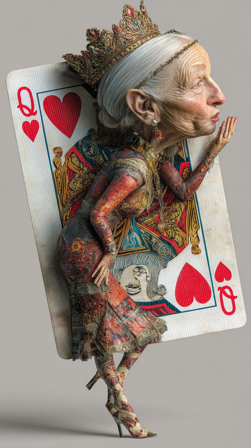 Insanely photo realistic magazine quality photograph, cinematic the card of the queen of hearts of playing cards. the card itself is 2d, the 60 year old beautiful woman, The queen steps out of the card and is blowing a kiss. Extreme 3d perspective, Very colorful artwork. Vivid colors --ar 51:91 --raw --profile fv5d2f2 --s 50 --v 7.0