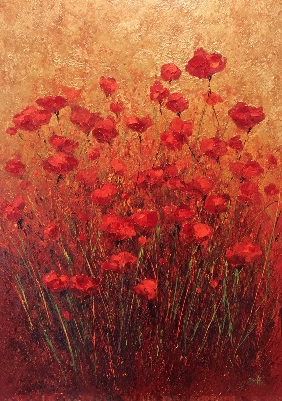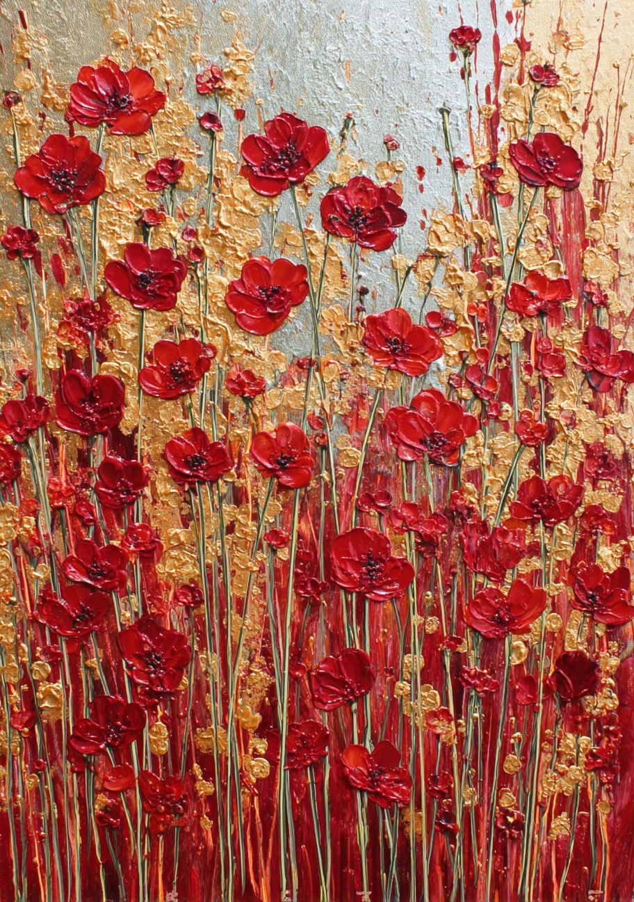 красные дикие цветы, поле цветов, текстурная картина, акрил на холсте, красно-золотая цветовая схема, масло.