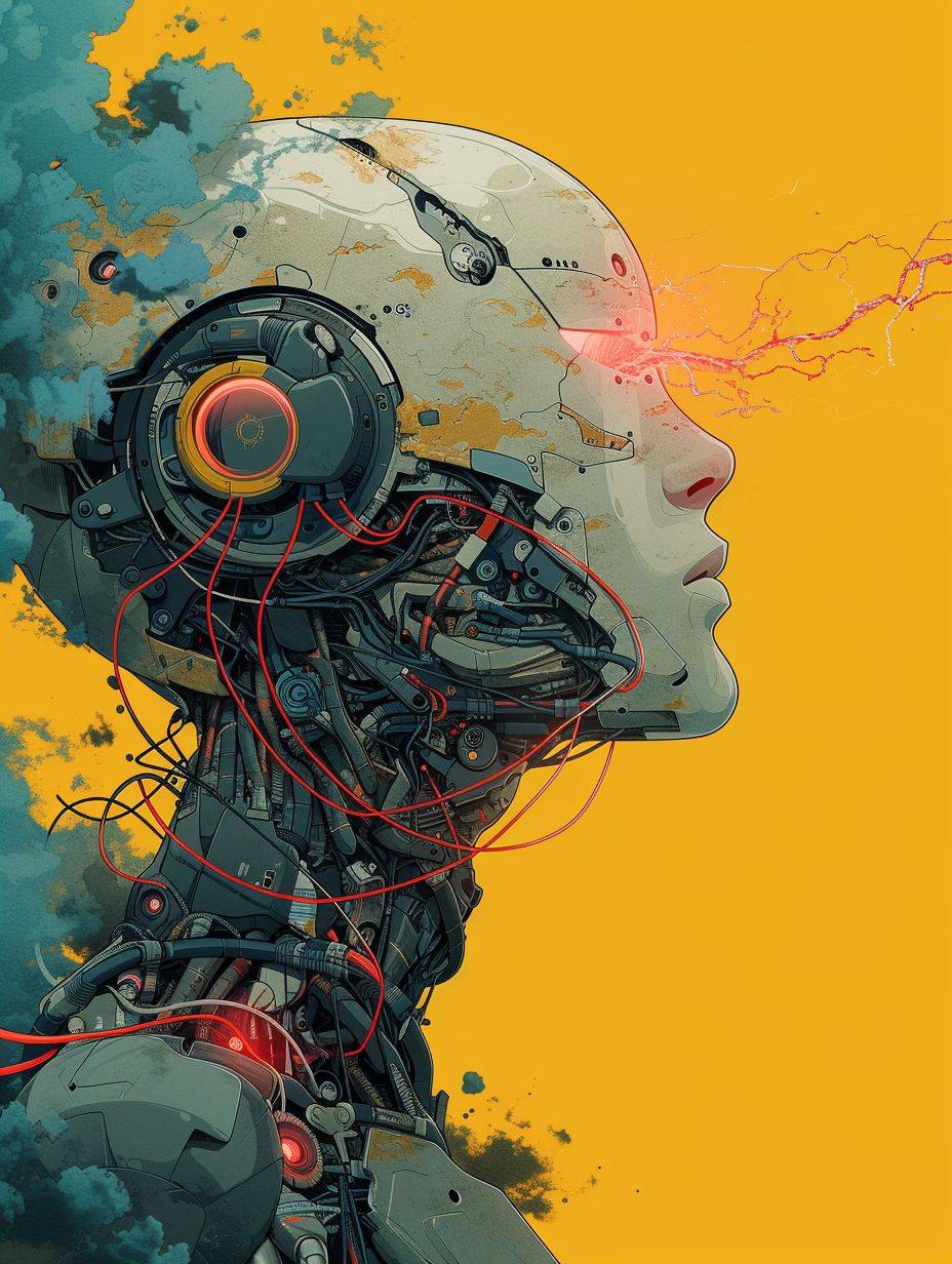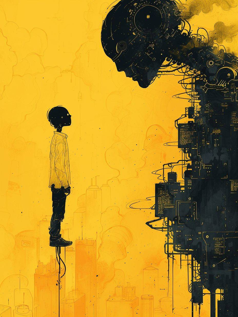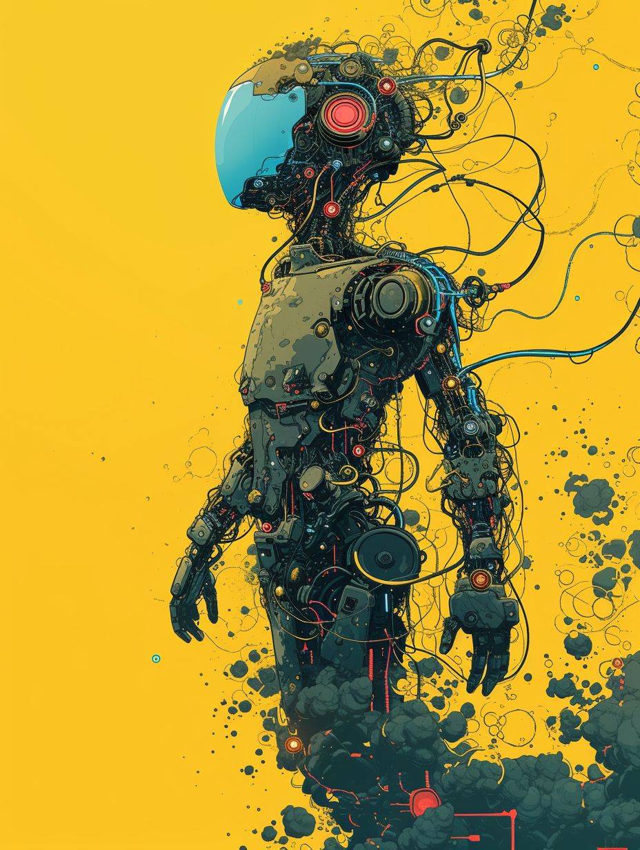 Японский стиль мультфильма, жёлтый фон, душа выходит из робота, душа парит, очень детализированная, механическая, электрическая