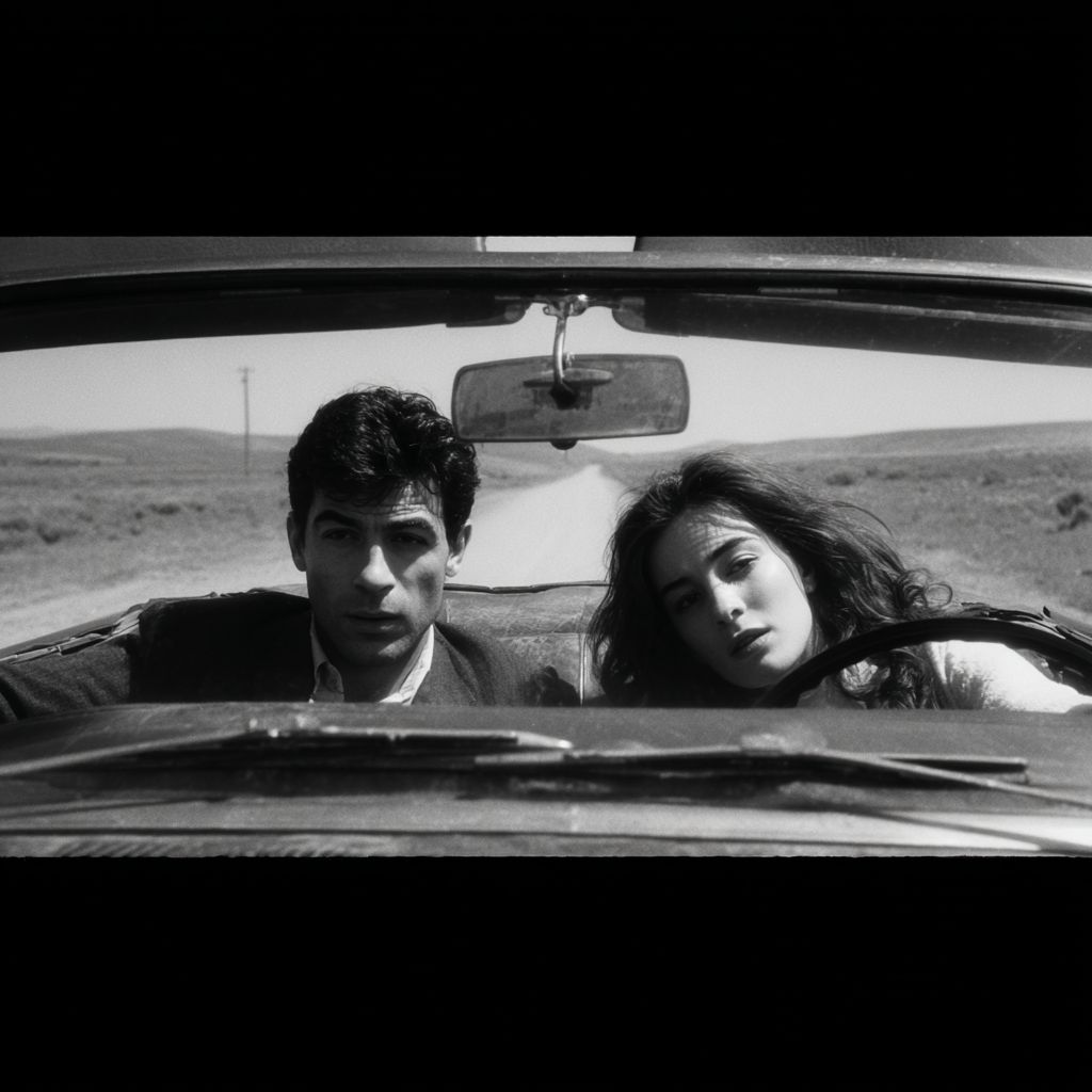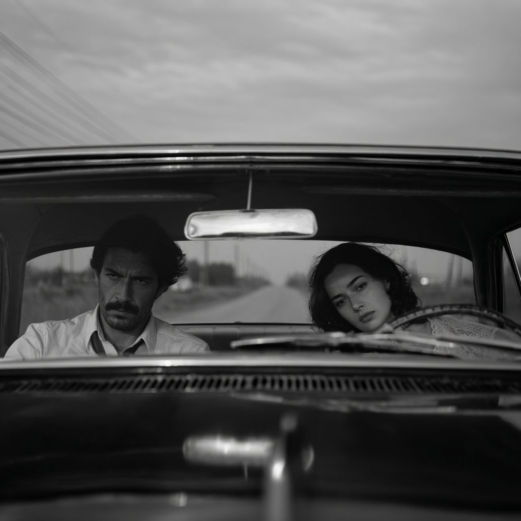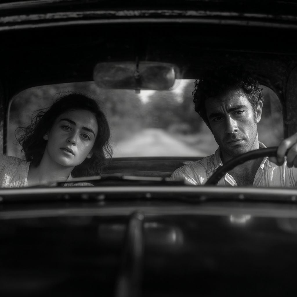 Черно-белый кинематографический фронтальный кадр снаружи стекла классического автомобиля 1960-х годов в движении. Внутри автомобиля пара покидает место: анатолийский длинноволосый мужчина с напряженным, сосредоточенным выражением лица управляет машиной, твердо держа руки на руле, в то время как женщина, изнеможенная или эмоционально подавленная, опирается на него. Одежда и прически соответствуют стилю 1960-х годов. В далеком фоне, едва видимом сквозь задний горизонт и отраженный свет. Снято так, как будто это арт-хаус или нео-нуар 1960-х годов с использованием оптики стиля Cooke Speed Panchro: мягкая мягкость, органичный контраст, легкое виньетирование и деликатное свечение бликов. Богатые средне-серые, глубокие, но не зажатые черные цвета, видимая зернистость 35-мм пленки, статическая камера, сдержанная композиция, вне времени и эмоционально насыщенная, без современной четкости, без цифровой ясности.