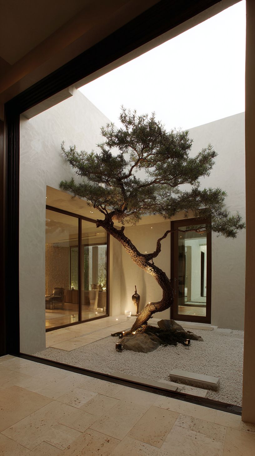 Современная высококачественная азиатская жилая архитектура, дзен минималистичный интерьер и дизайн двора, открытая гостиная, выходящая на частный двор, крупномасштабная чистая геометрия, сильный архитектурный порядок, основной природный фокус: одно скульптурное дерево во дворе, тёплое натуральное дерево, светлый каменный пол, тонкие штукатурные стены, мягкое, но мощное освещение, скрытые светильники, кинематографическое светотень, минимальная мебель, изящные небольшие предметы, тихая, спокойная, роскошная жилая среда, ультрареалистичная архитектурная фотография