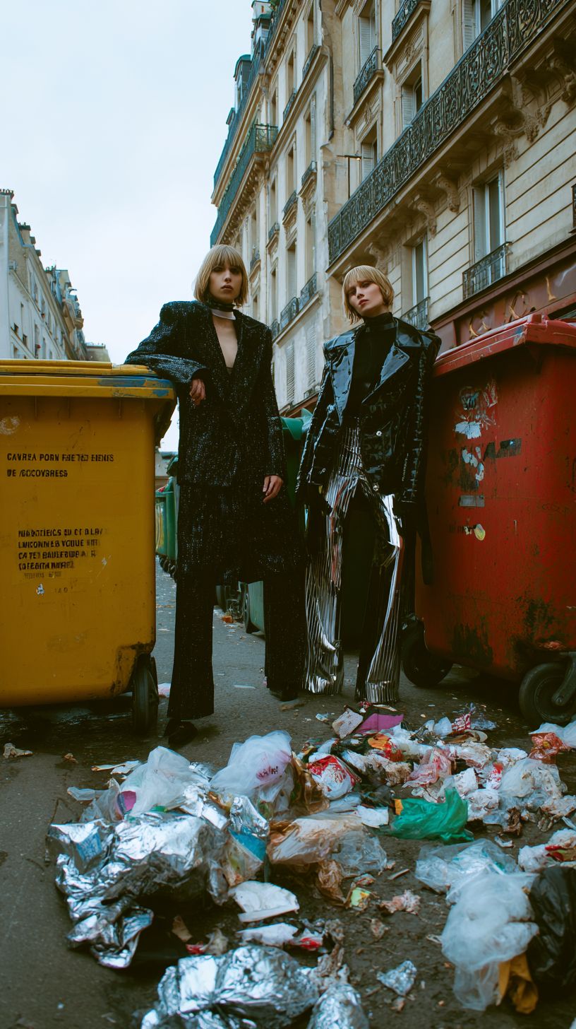 Luxury Y2K fashion with french touch in Paris, garbage bins in the street in Paris, fashion editorial shoot, vinyl, surrealistic --ar 9:16 --raw --profile ss1urjs --s 50