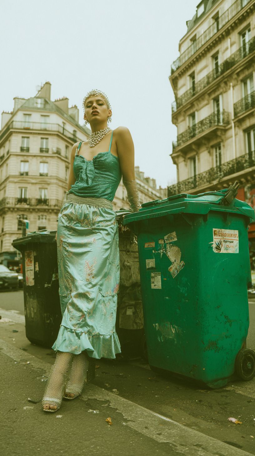 Роскошная мода Y2K с французским акцентом, мусорные контейнеры на улицах Парижа, модная редакционная съемка, винил, сюрреализм