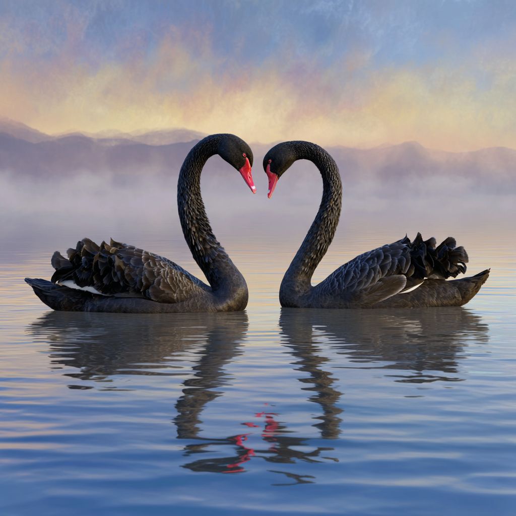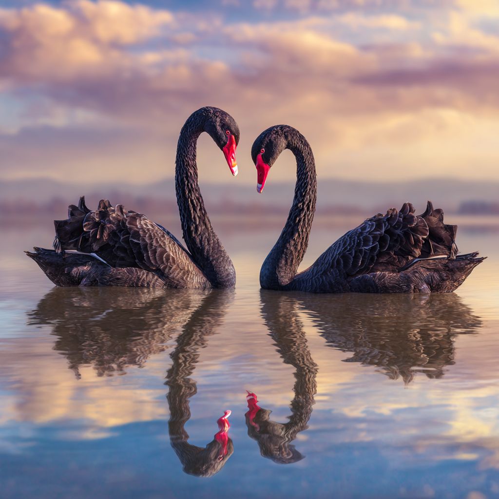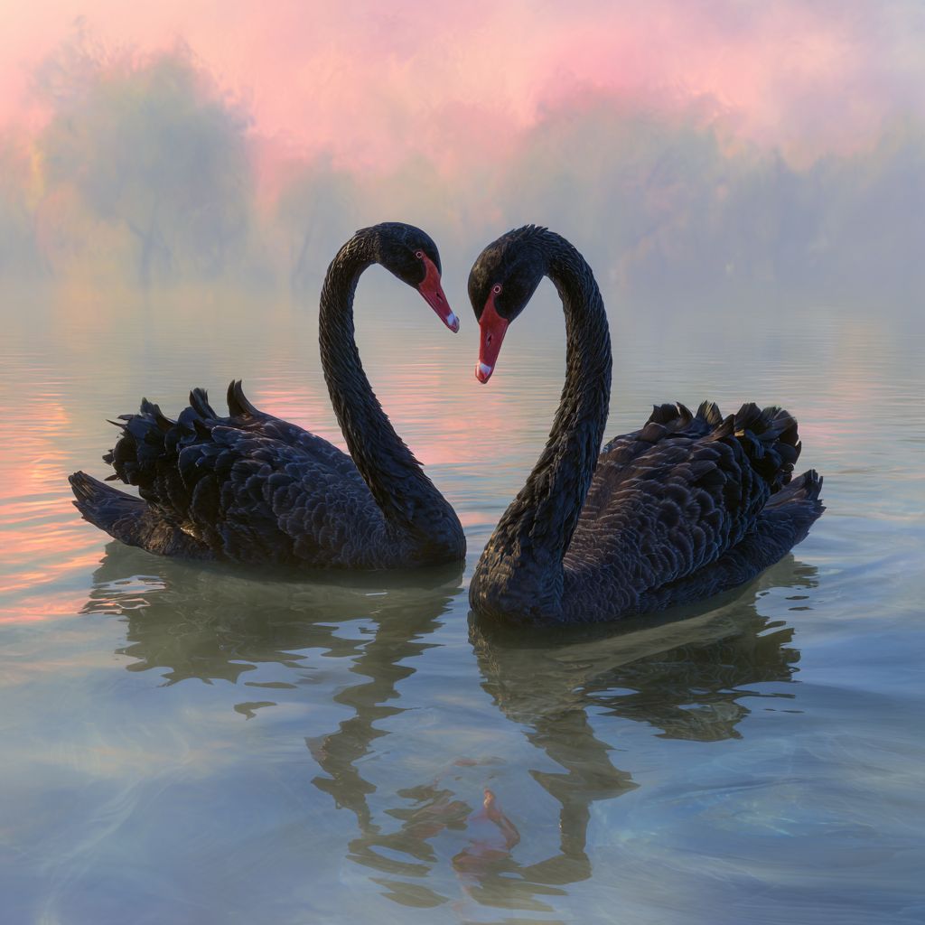 Ультрареалистичная сцена двух элегантных черных лебедей на спокойном голубом чистом озере, стоящих друг напротив друга с изогнутыми шеями, образующими идеальную сердцевидную форму. Мягкое пастельное утреннее небо с золотыми и розовыми оттенками, отражающимися на воде, легкие рябь на поверхности озера, похожей на стекло, детализированная текстура пера лебедей с четкими бликами и тенями, естественное мягкое освещение, высокая динамическая диапазонность и контраст фона, фотореалистическая натуралистическая фотография, резкий фокус на лебедях, высокая глубина резкости, реализм в стиле National Geographic, спокойное и безмятежное настроение.