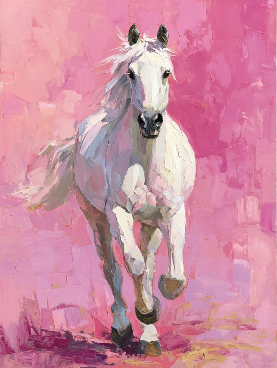 Акриловая пастельная живопись белой лошади, бегущей к камере на розовом фоне, с яркой схемой цветов в розовом и золотом и выразительными мазками. Большие холстные картины, очаровательные иллюстрации персонажей, представлены в анфас, выполнены маслом на холсте с преобладающим розовым тоном.