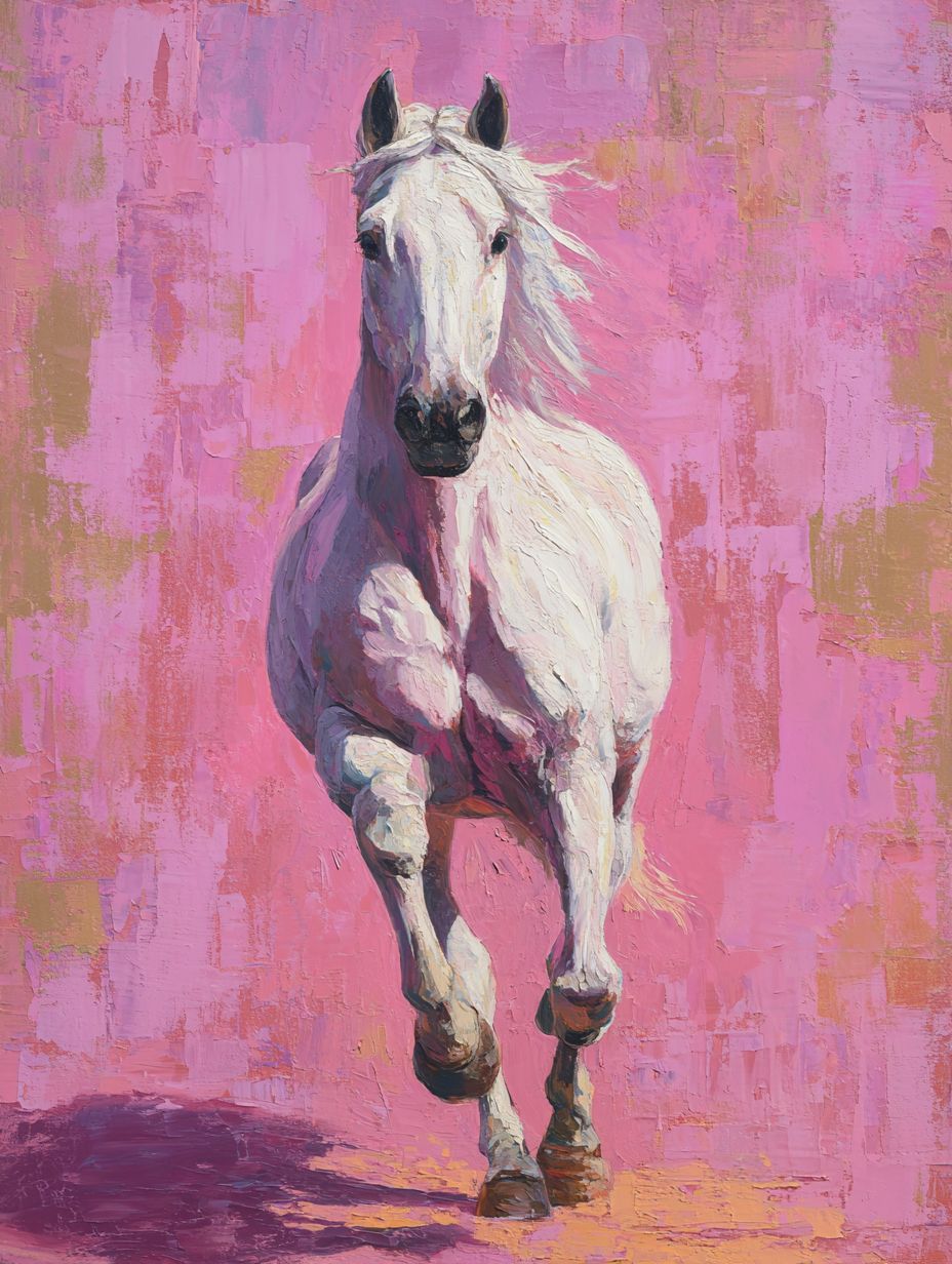 acrylic pastel painting of a white horse, running towards the camera, against a pink background, in a bold, pink and gold color scheme with expressive brushstrokes. large canvas paintings, charming character illustrations, presented in a front view, rendered in oil on canvas with a predominant pink tone. --ar 3:4