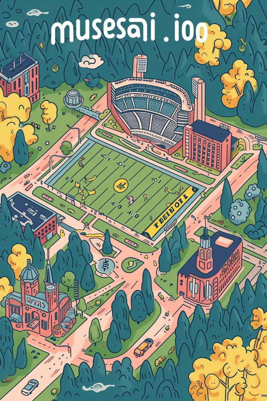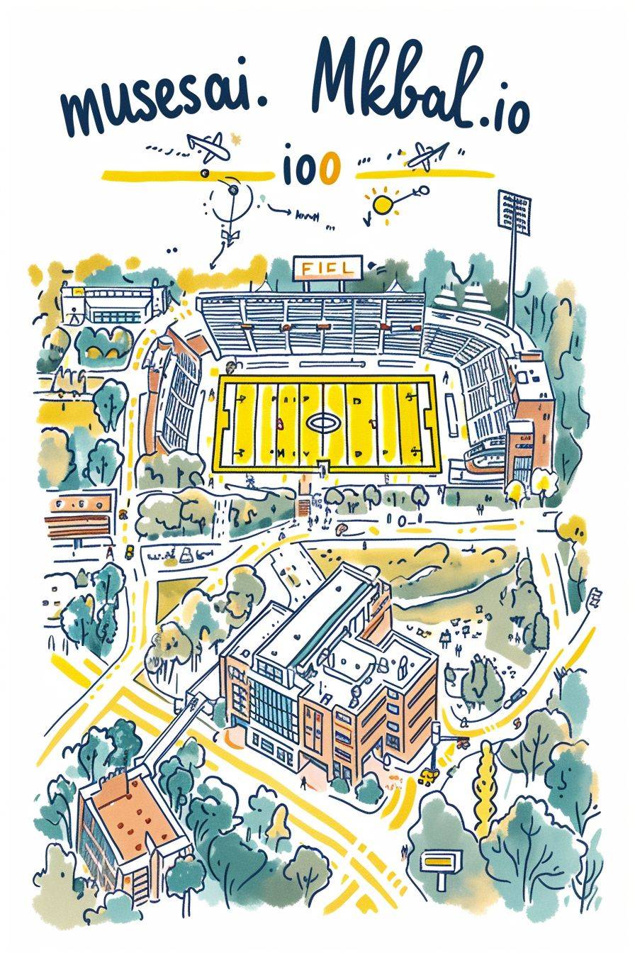 No Human Artistic hand-drawn sketchnote style travel map of Michigan Stadium Digital with the text "musesai.io" at the top, showcasing key landmarks. Emphasize a blend of accuracy and artistic flair, using vibrant colors and a variety of line weights for a dynamic, inviting look. The overall feel should be both informative and visually enchanting, inviting viewers to explore the city through the map --style raw --ar 2:3 --v 6