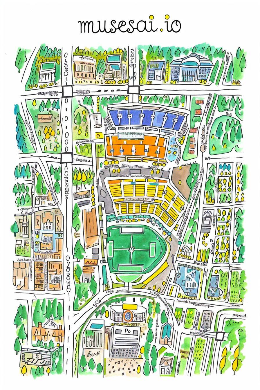 Карта путешествия в стиле наброска, выполненная вручную, без участия человека, цифровая карта стадиона Мичиган с текстом «musesai.io» вверху, показывающая ключевые ориентиры. Подчеркните сочетание точности и художественного стиля, используя яркие цвета и различные толщины линий для динамичного и притягательного вида. Общее впечатление должно быть как информативным, так и визуально завораживающим, приглашая зрителей исследовать город через карту.