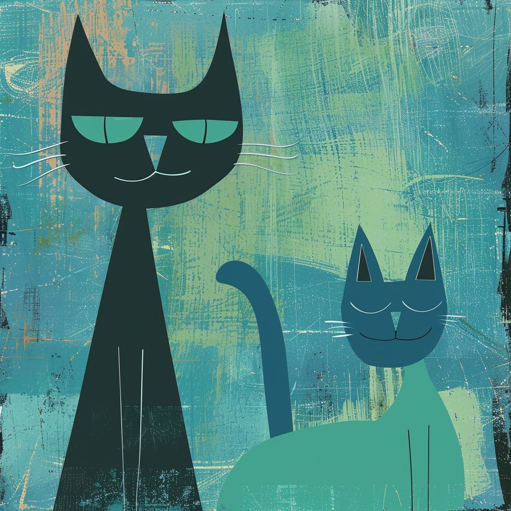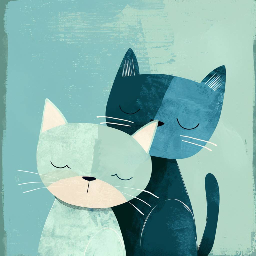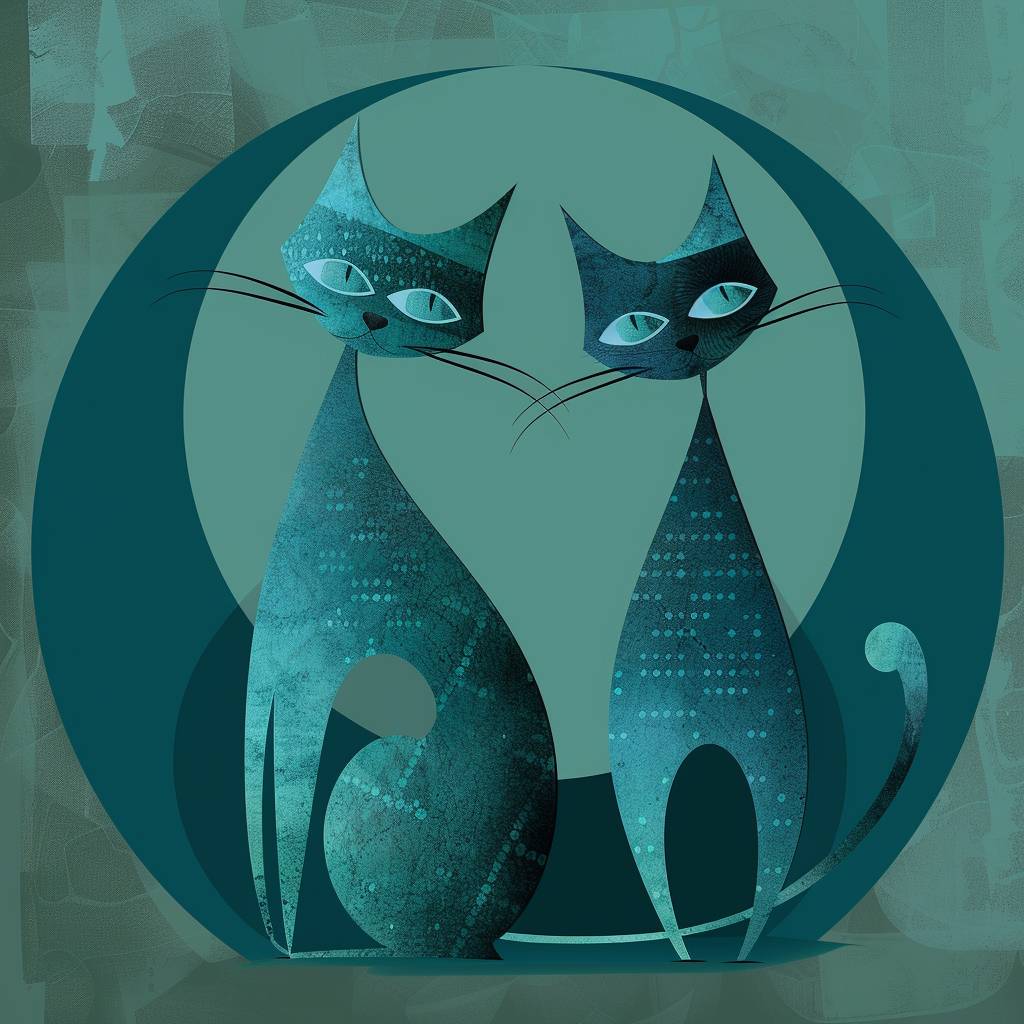 Две мирные, счастливые кошки с элегантными деталями, текстурированный фон в голубовато-зеленых цветах, простые формы и эпическая компоновка в плоском векторном искусстве.