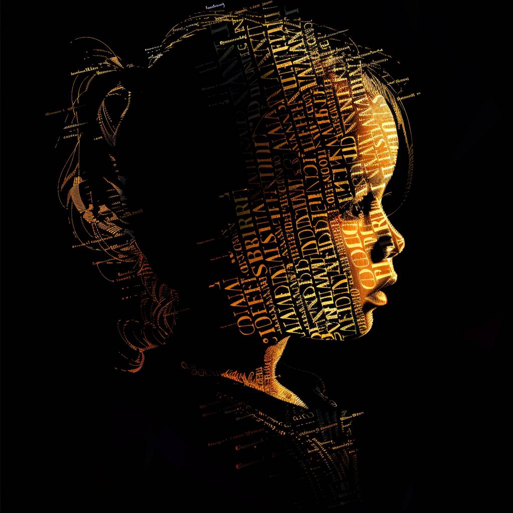 Портрет ребенка, созданный из слов, в стиле векторной иллюстрации, золотой свет, высокий контраст, силуэтное освещение, черный фон, типографическое искусство.