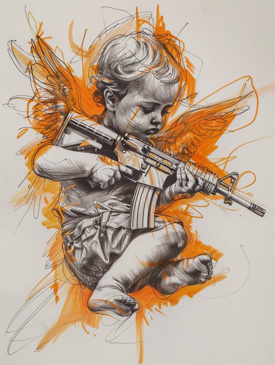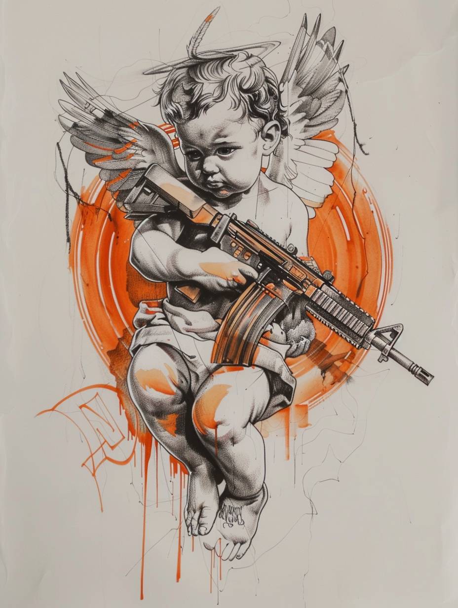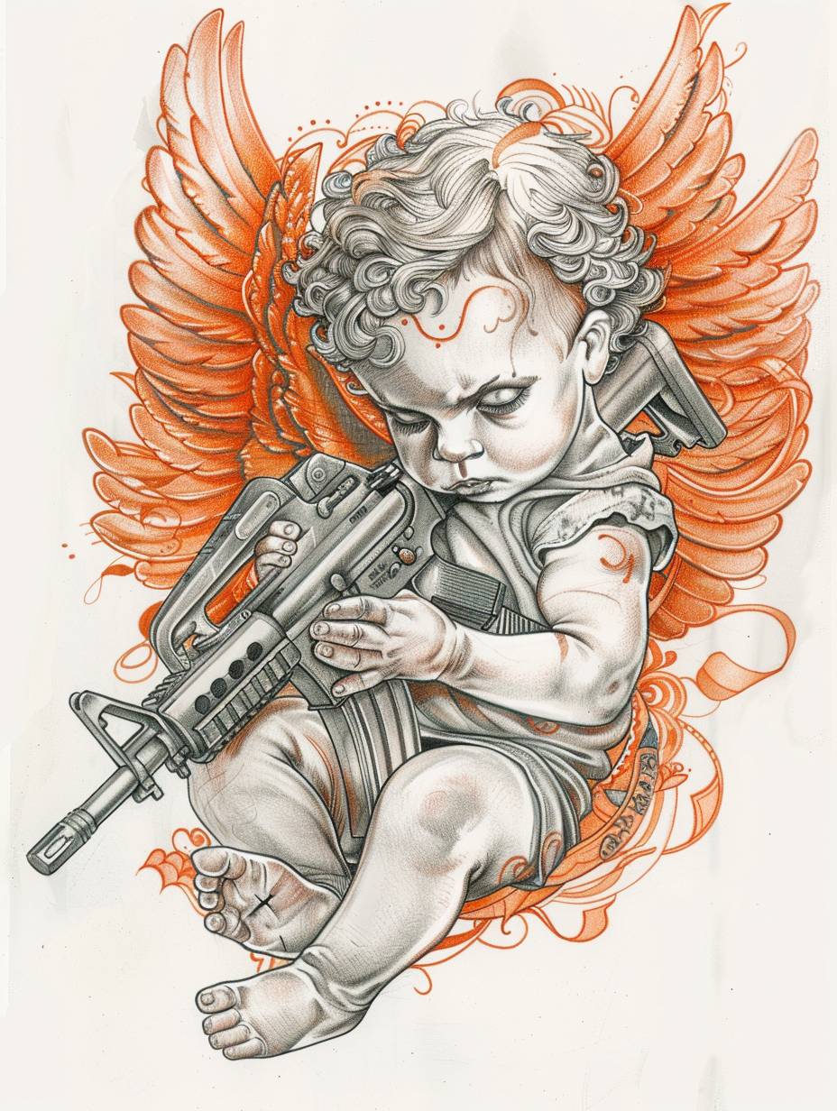Дизайн татуировки с ангелом-бебе и АК47 в оранжевом и сером цвете