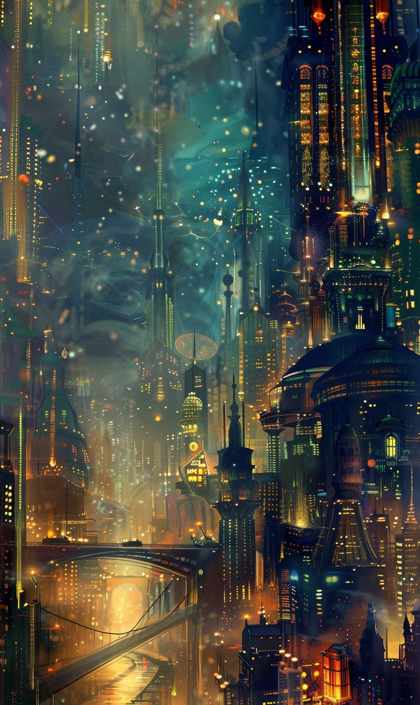 Art Nouveau, Anderson's fairy tale illustration, stylish city with bright lights, mysterious and dreamy, extremely sophisticated --ar 3:5 --v 6.0
