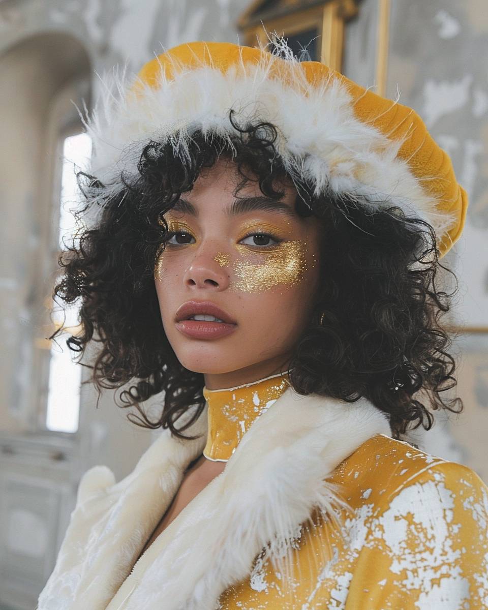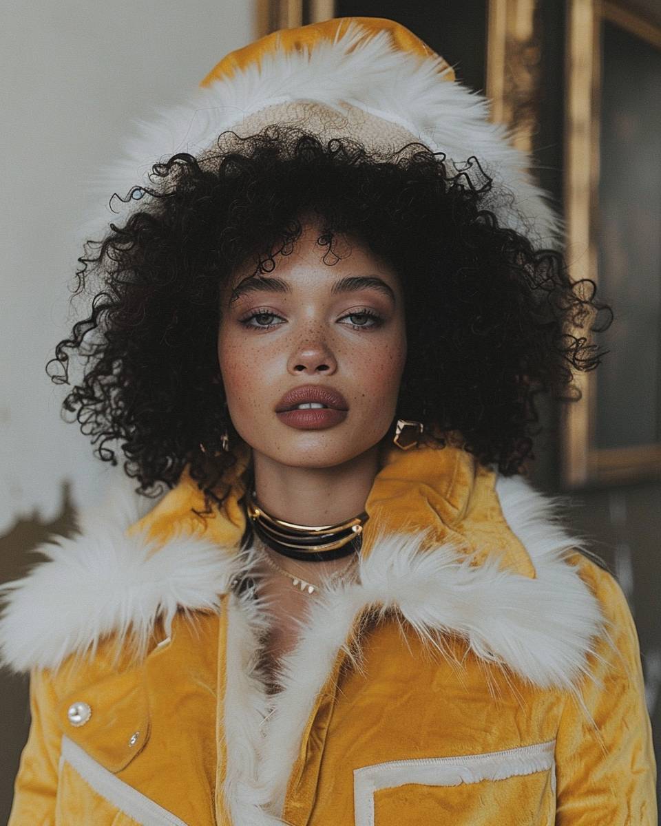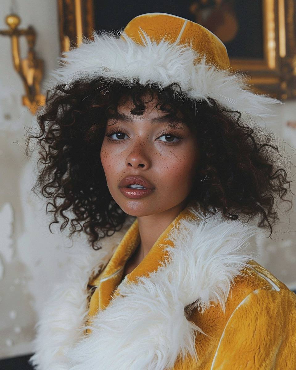 editorial fashion photo young african american female model with curly hair, wearing a bright neon yellow gold fur jacket with white fur trim, yellow gold fur hat, opulent indoor vintage decor, --ar 4:5 --style raw --sref 59239704 --s 450 --v 6.0