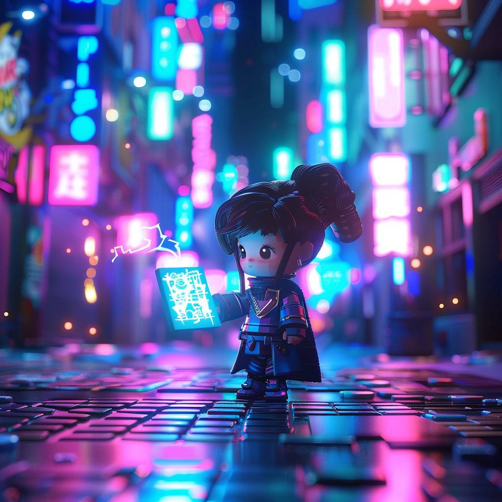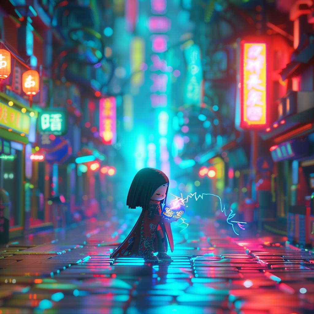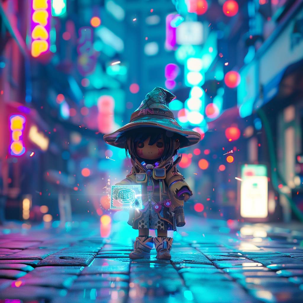 Кадр стоп-моушн анимации с изображением 3D чиби-стиля маленькой female mage. Она заклинула заклинание из голографической книги, стоя посреди улицы неоново-освещенного киберпанковского города.