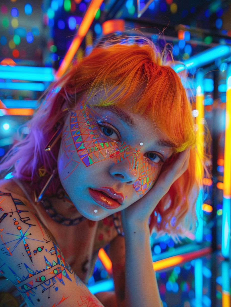 A young woman with vibrant neon hair and geometric Art Deco patterns painted on her face, posing in a surreal, dream-like setting with mirror-like floors and walls reflecting her image. --ar 3:4 --v 6.0 --style raw