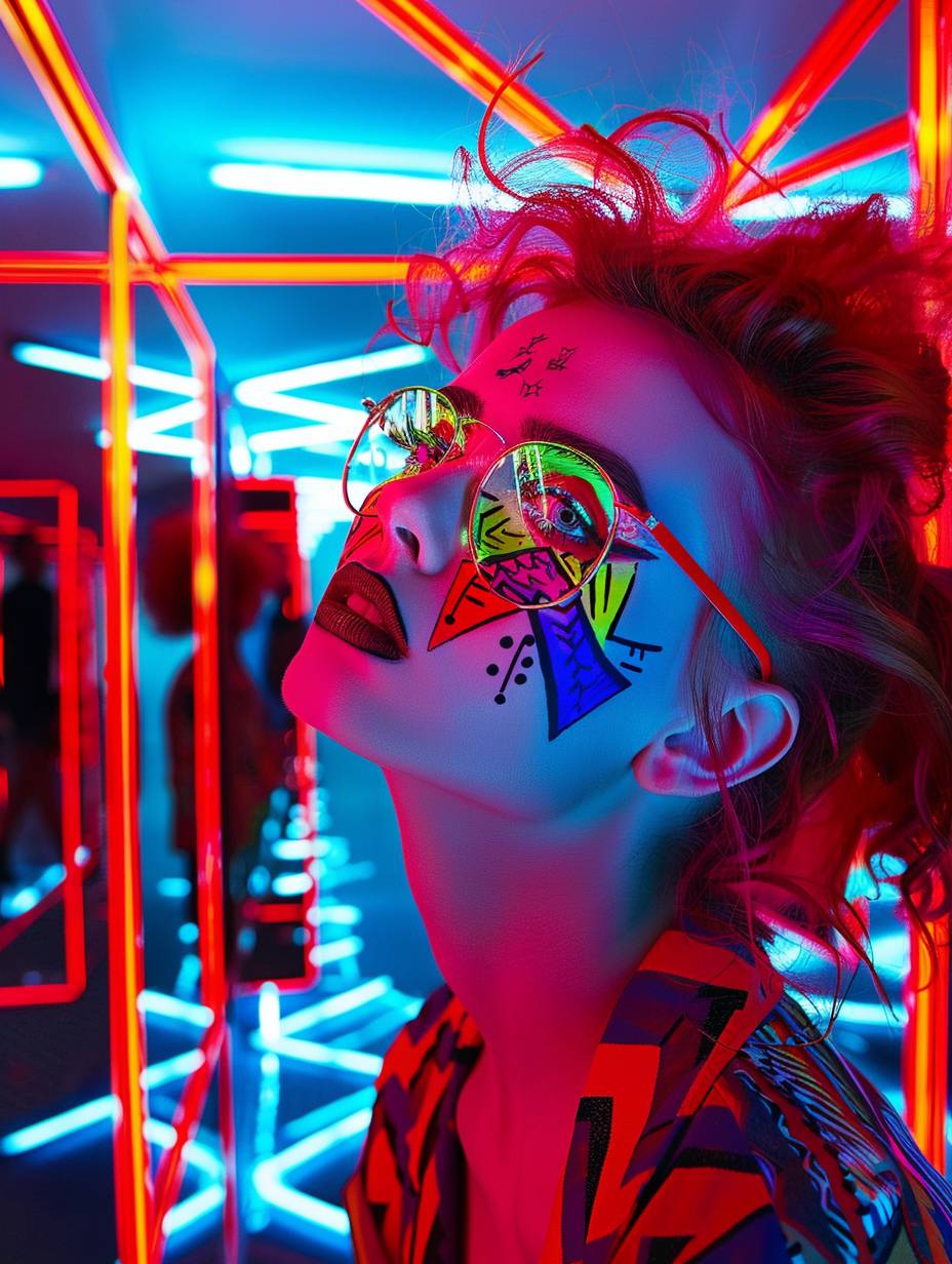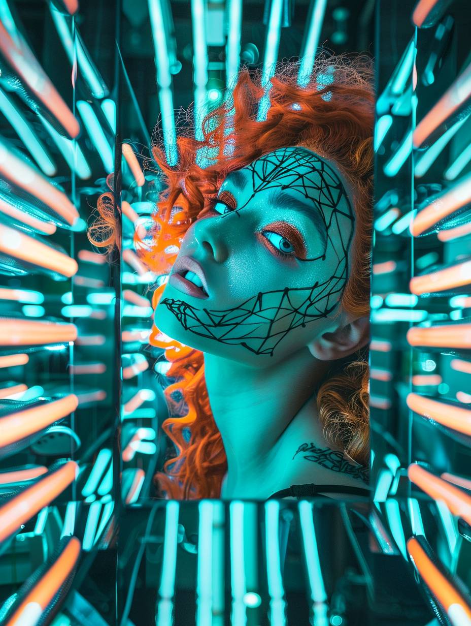 Молодая женщина с яркими неоновыми волосами и геометрическими узорами в стиле ар-деко на лице, позирующая в сюрреалистичной, схожей с сном обстановке с зеркальными полами и стенами, отражающими её образ.