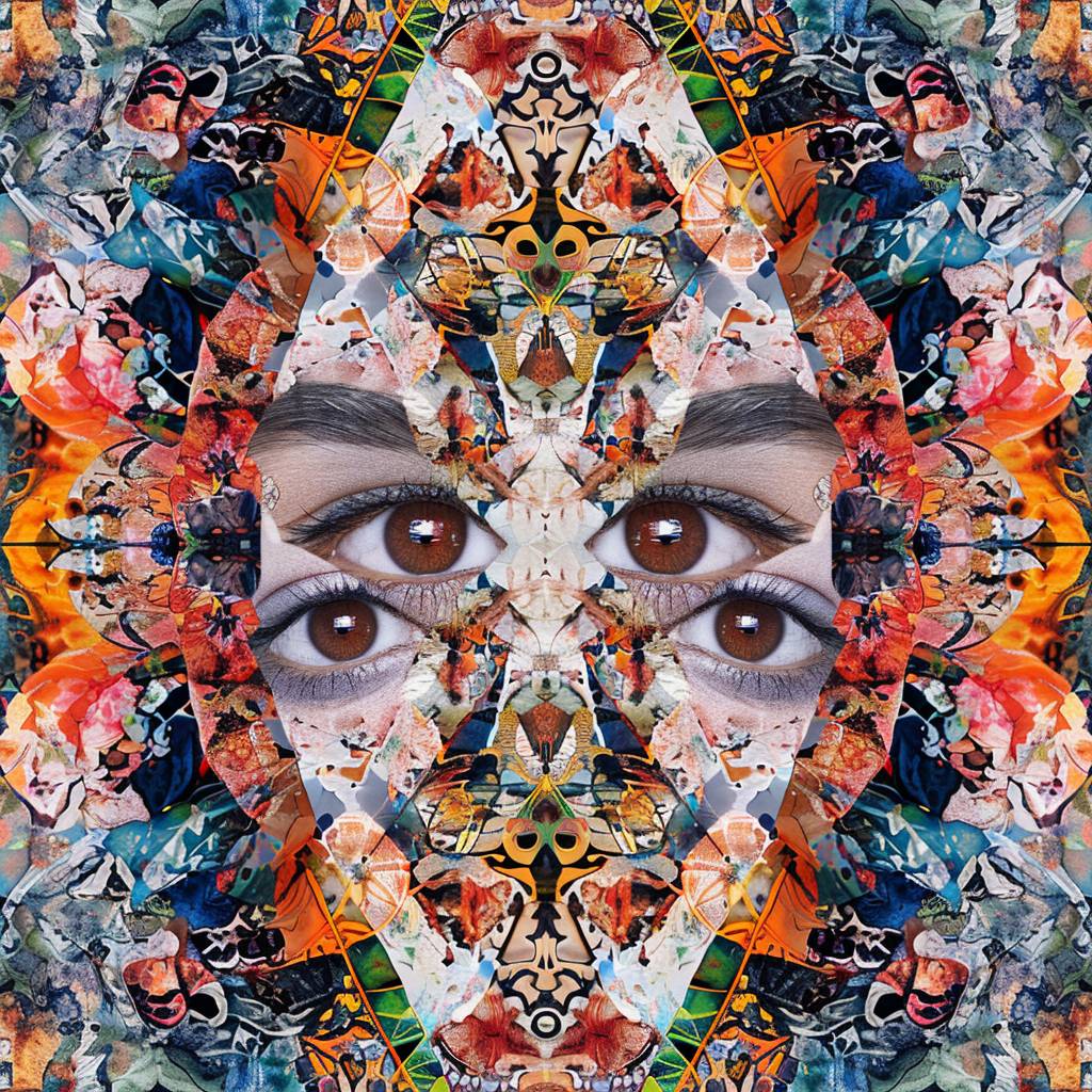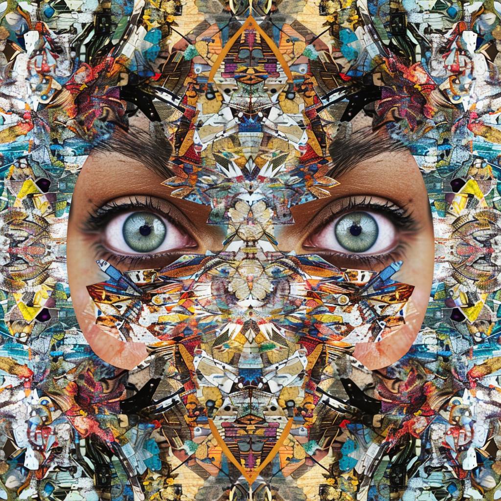 Калейдоскопический узор коллажных изображений, формирующий форму и лицо [SUBJECT], симметричный, в стиле смешанных медиа, цифровое искусство, сложные детали, яркие цвета.
