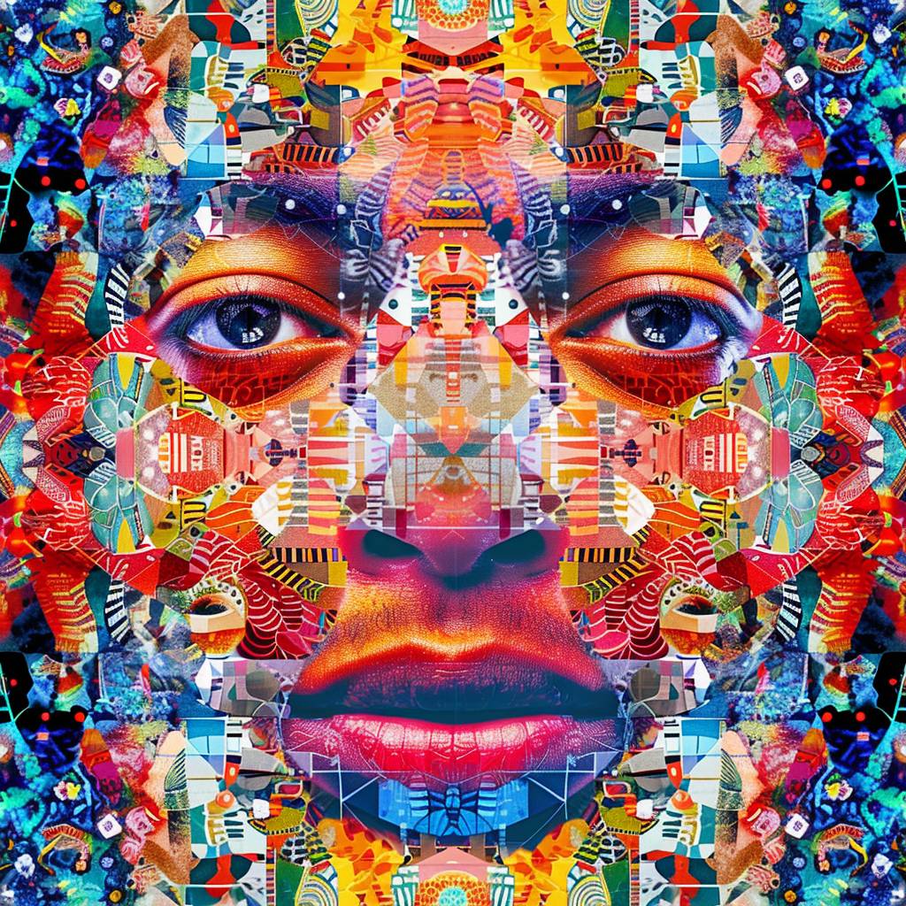 Яркое коллажное искусство, формирующее симметричный узор и форму лица.