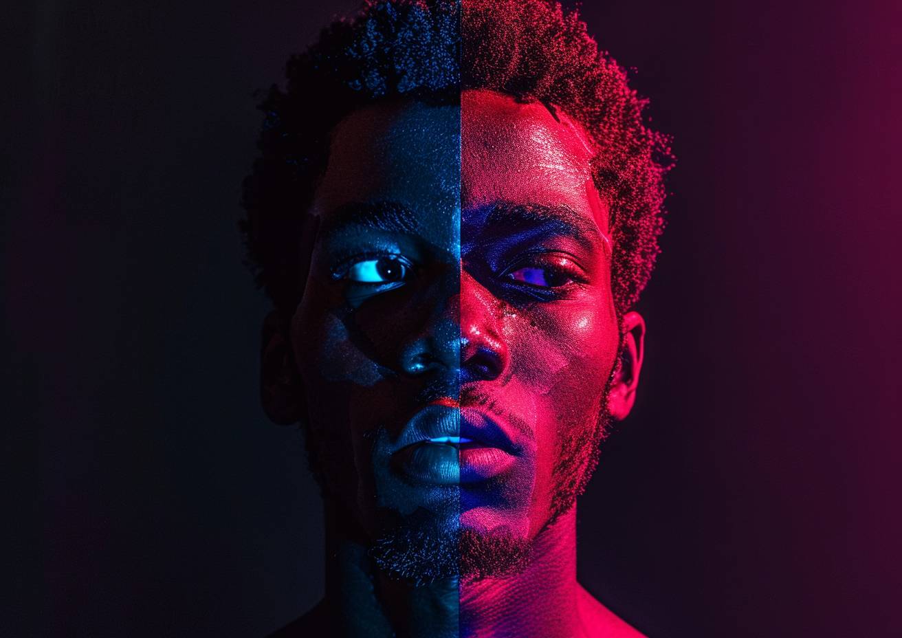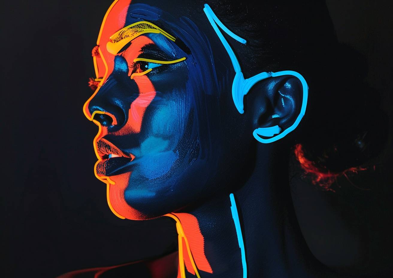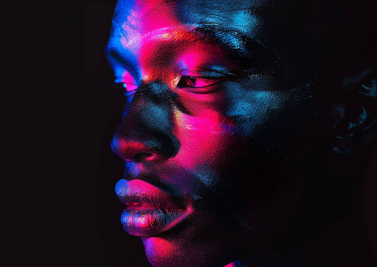 Портрет [ТЕМА] в неоновом [ЦВЕТ] и глубоком черном. Половина лица драматически освещена неоновым [ЦВЕТ] светом, создавая резкие тени и эффект высокого контраста, в то время как другая половина остается в глубокой тени на минималистичном черном фоне.