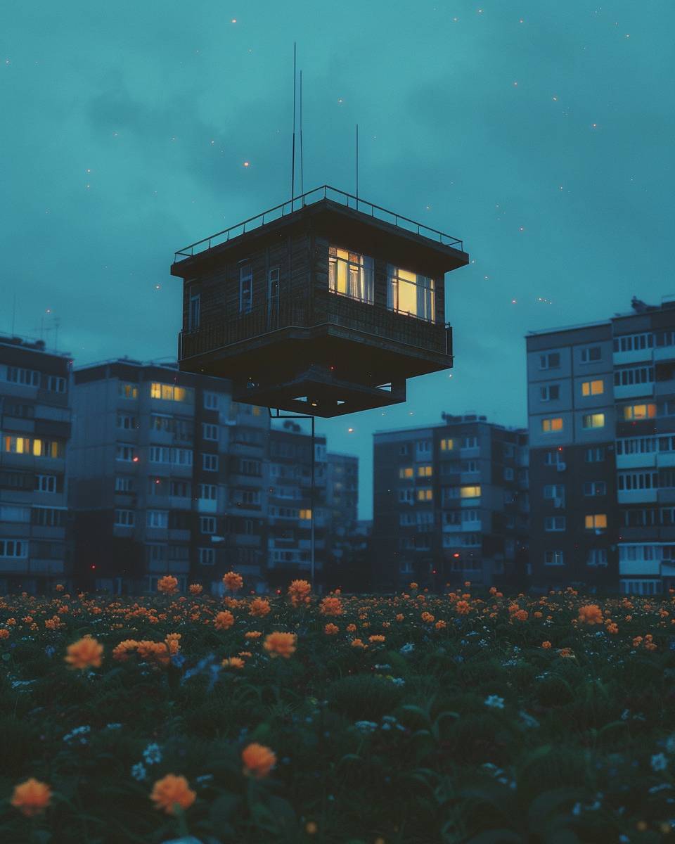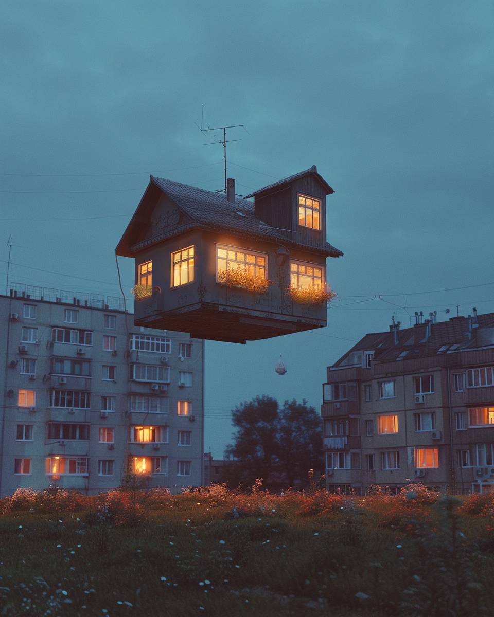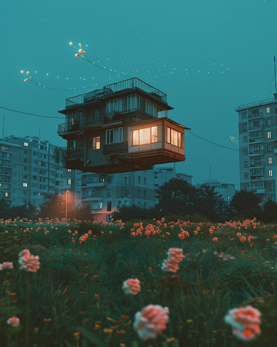 Летящий дом с светящимися окнами на закате парит над полем с светящимися цветами, перед зданием жилых комплексов. Изображение имеет зернистую, низкокачественную эстетику, напоминающую аналоговую фотографию. Небо глубокого синего цвета, и сцена обладает слегка сюрреалистичным, мечтательным качеством.