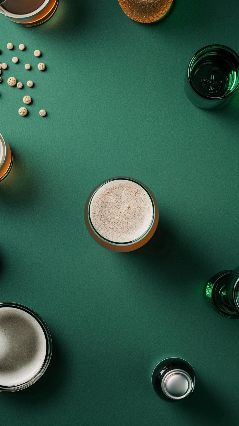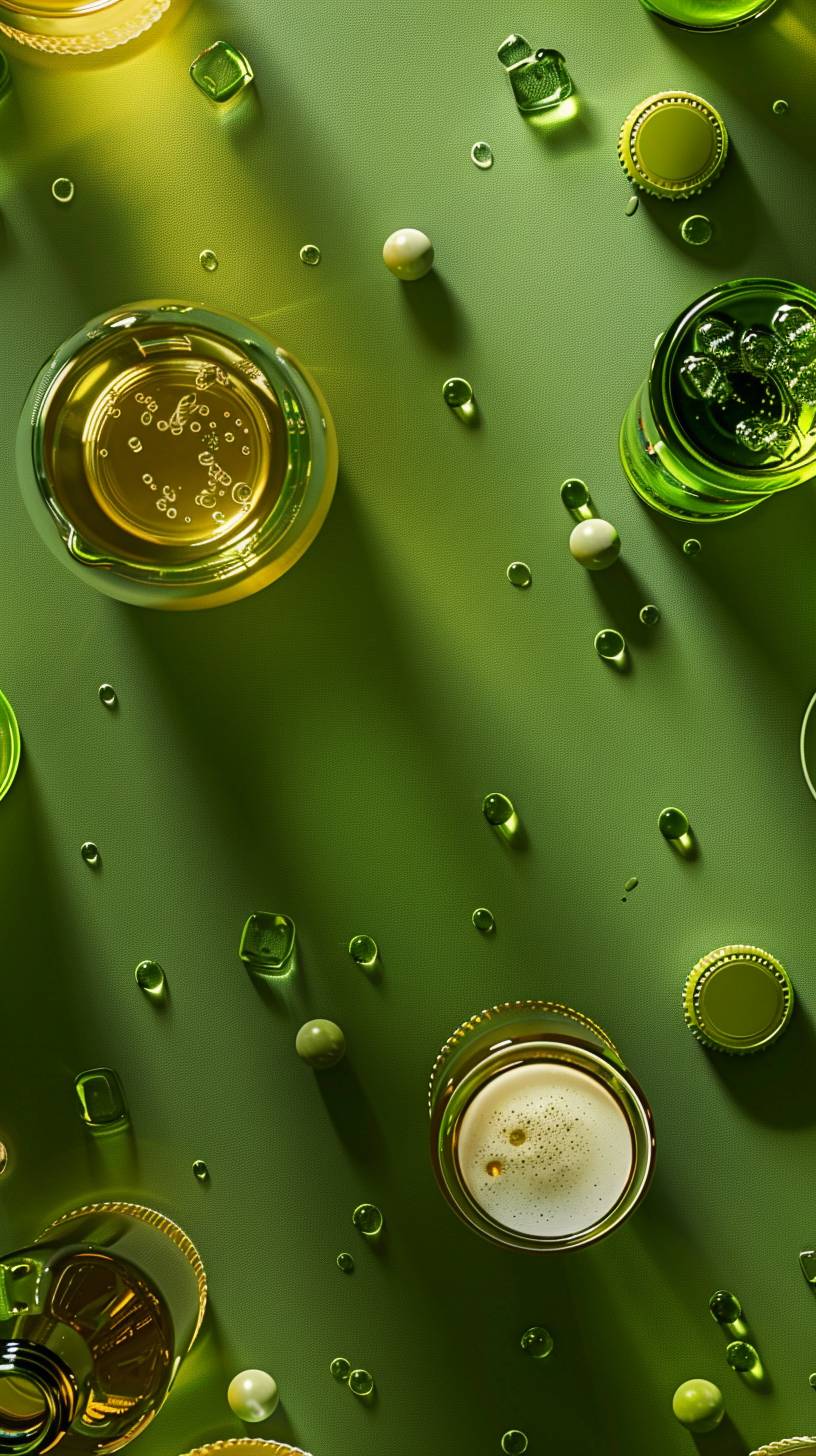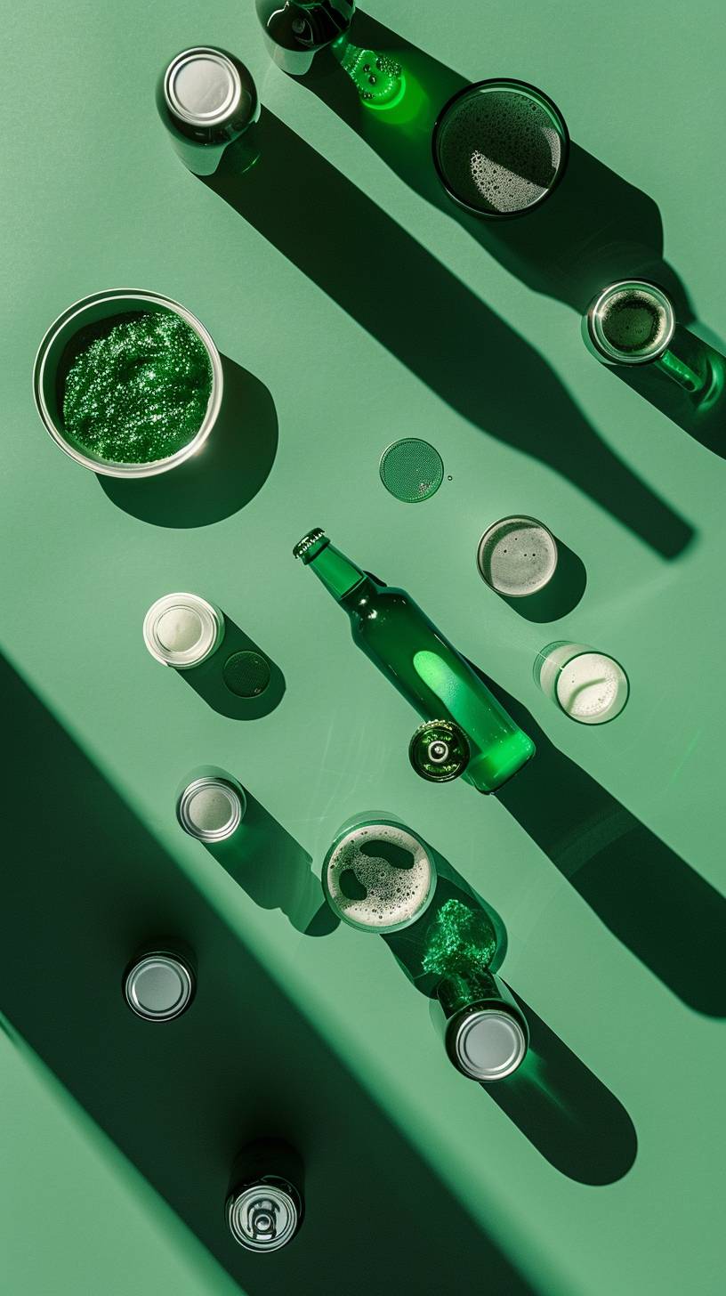 photorealistic flatlay, top-down shot of 10 essential office items lay out neatly on a flat clean background, with an empty area left with beer circle. Hues of green. Ultra hyperealistic, cinematic lightning, high detailed, high quality. --ar 9:16 --v 6.0