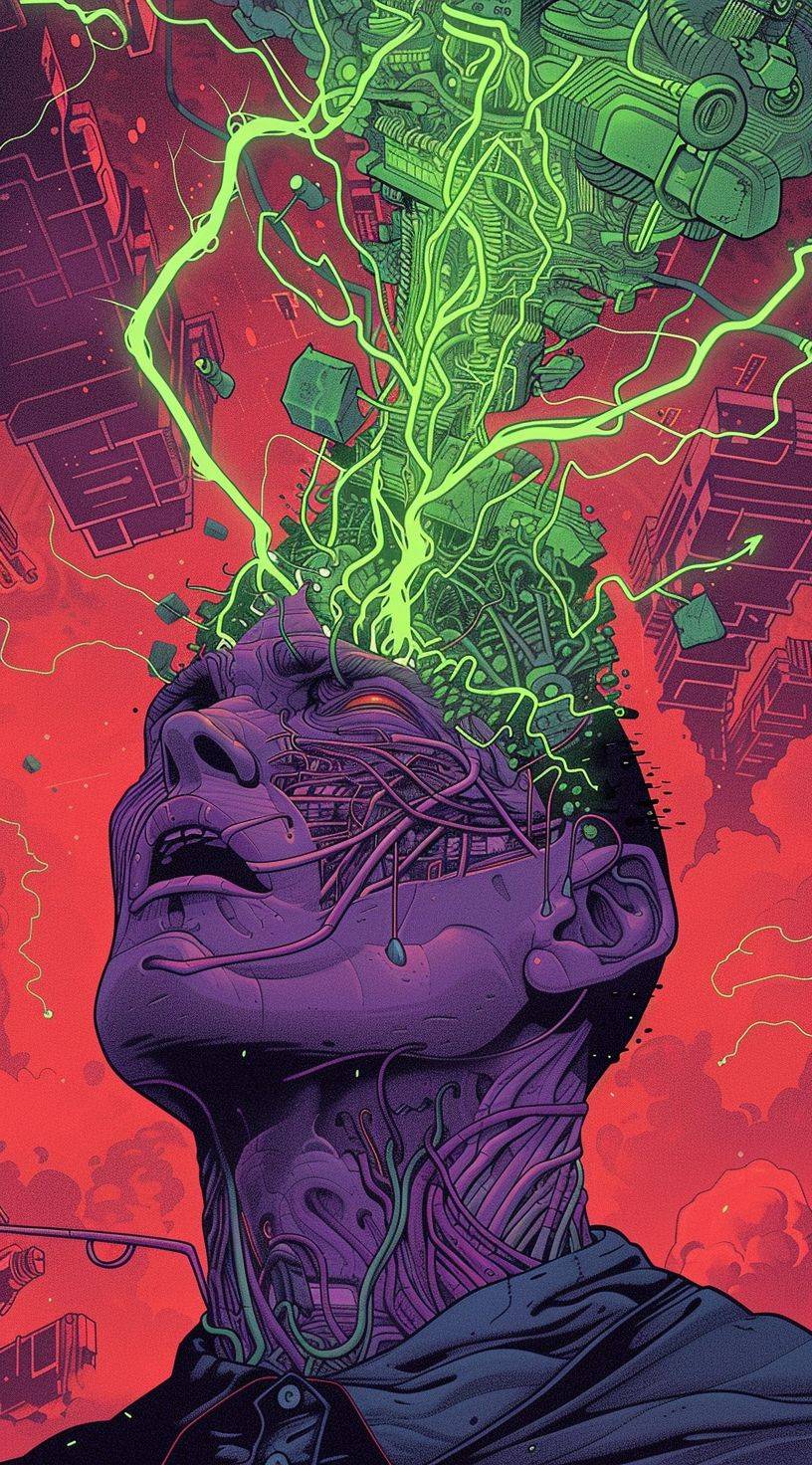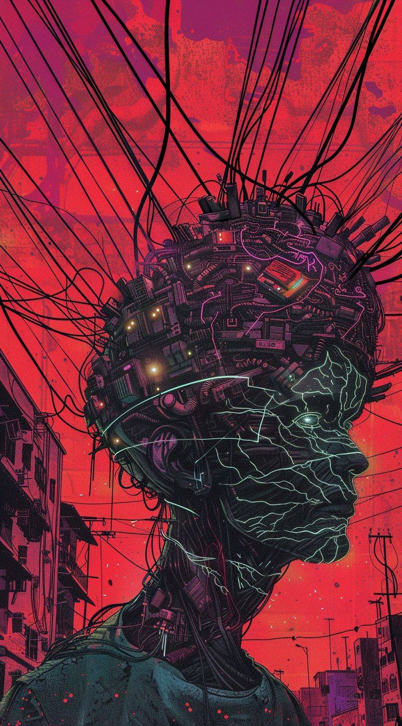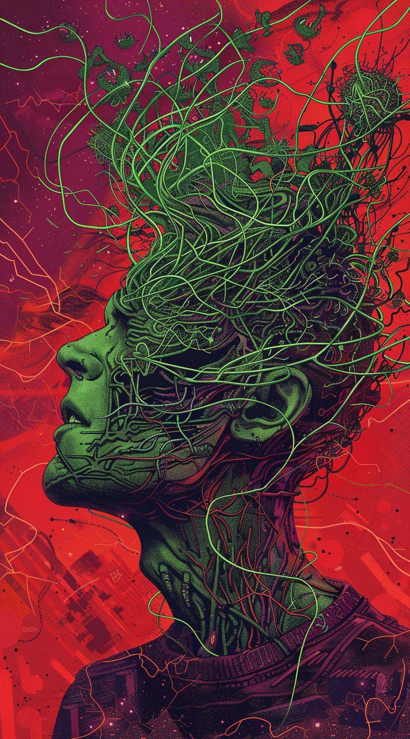 Голова персонажа в красной среде с электрическими проводами, исходящими из нее, изображенная в фиолетовом и зеленом цветах, с гипердетализированным комикс-стилем и иллюзиями в стиле киберпанк.