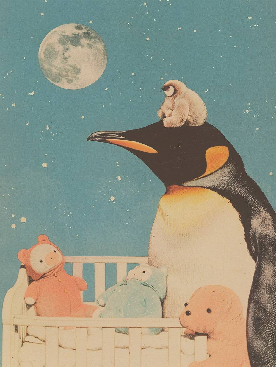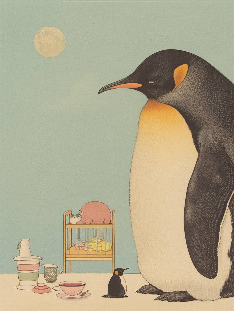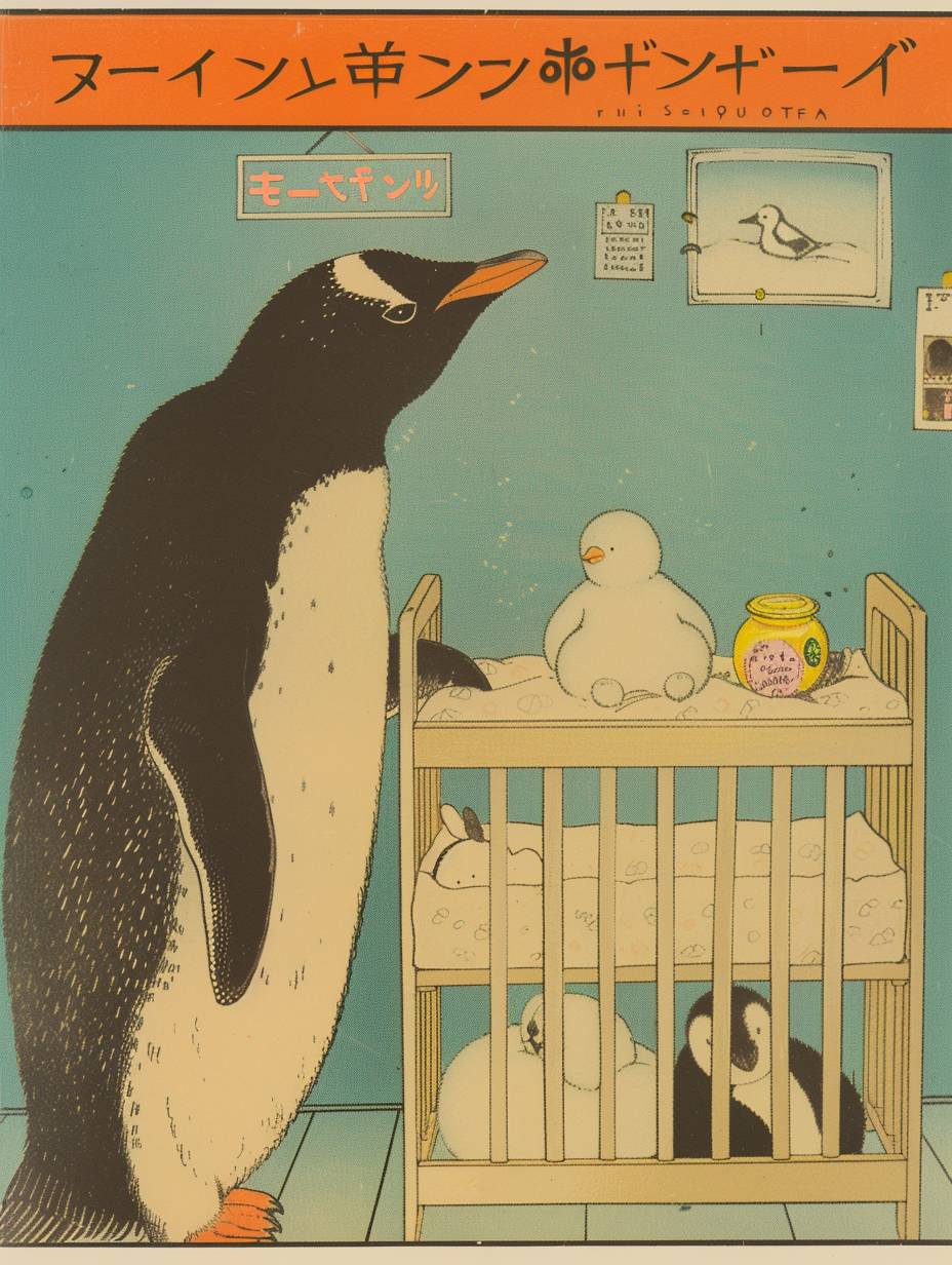 a penguin pointing at a crib filled with baby items. Caption: "Is this a full night's sleep? by Jiro Kuwata --ar 3:4 --style raw --personalize 6bjcfm9 --stylize 1000 --v 6.0