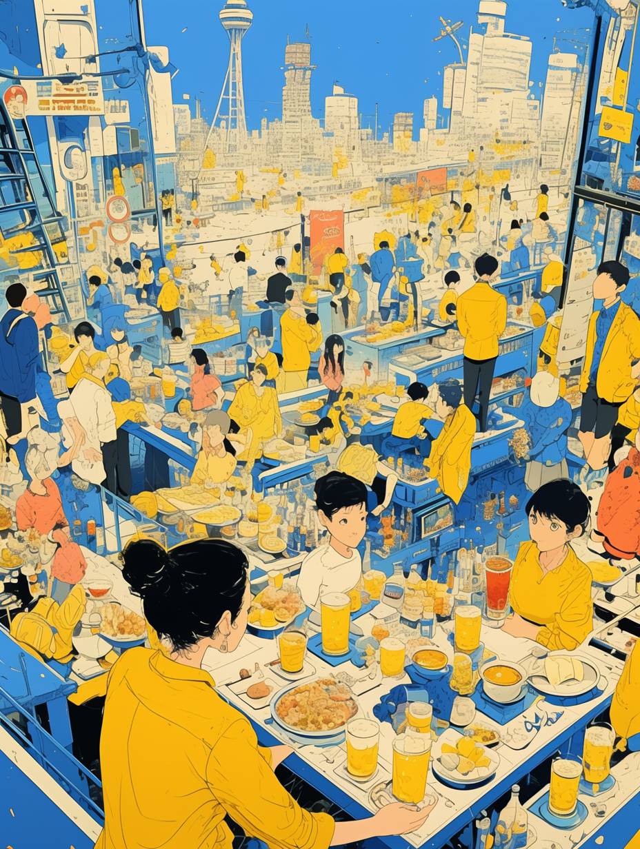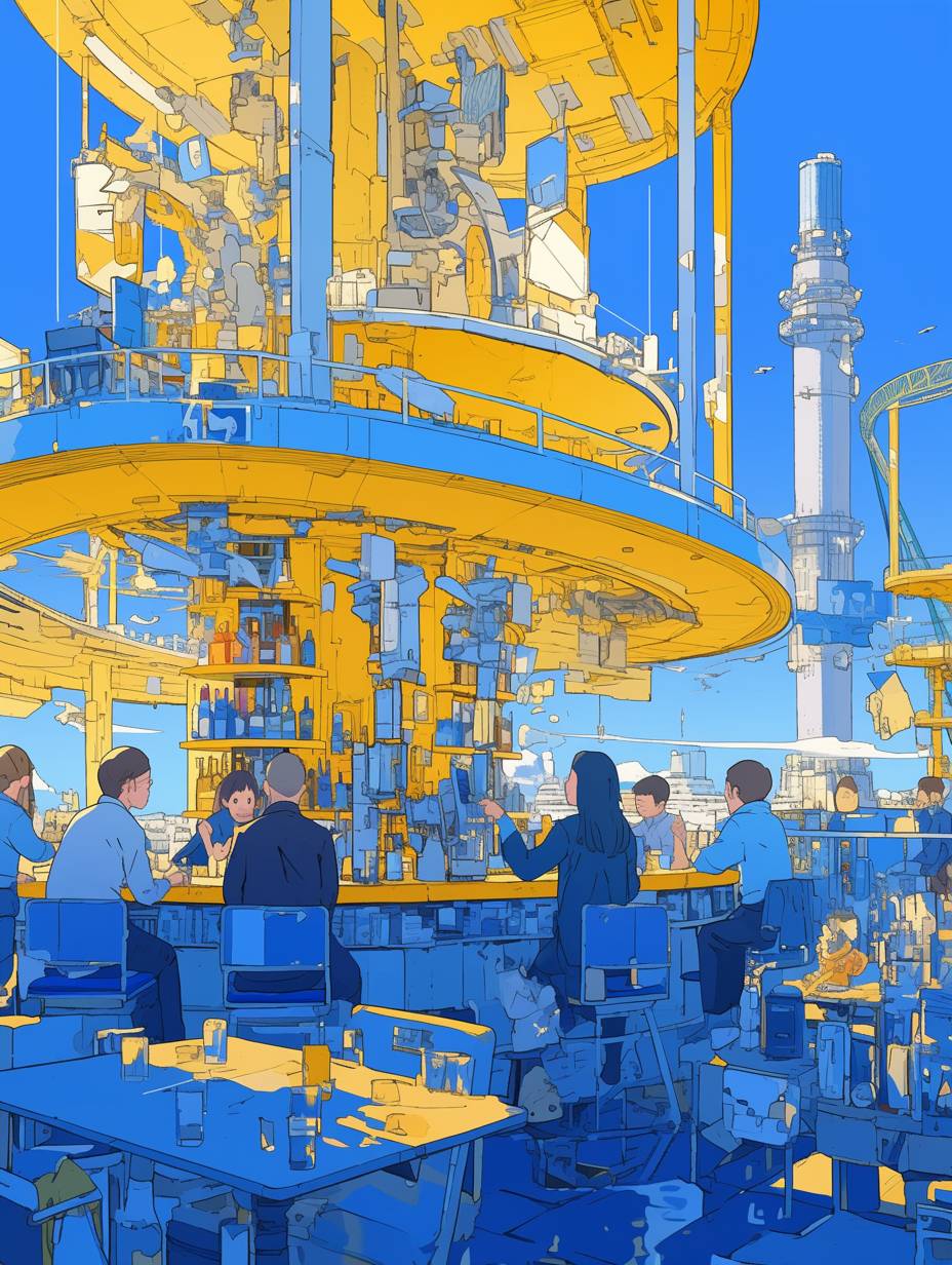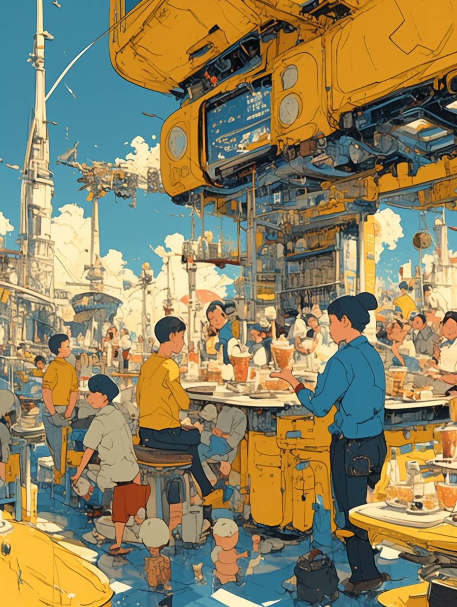Интерьерная сцена в баре на гигантском корабле с желто-синим цветовым оформлением. Азиатская девушка-клерк обслуживает напитки другим азиатским клиентам, дети играют вокруг. Видны американские горки и башня за окнами, изображенные жирными линиями и винтажными цветами в стиле японской анимации и иллюстрации детских книг.