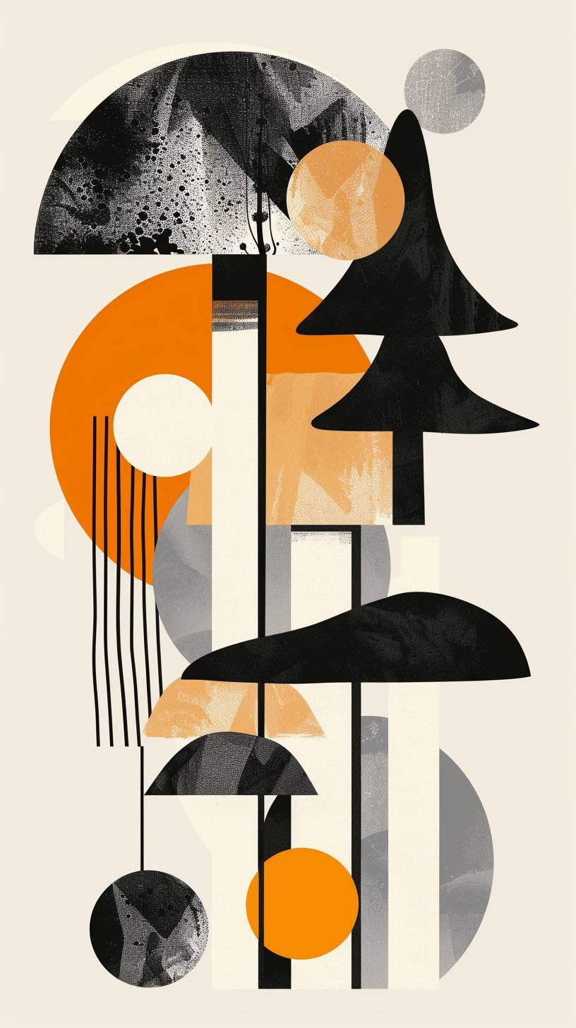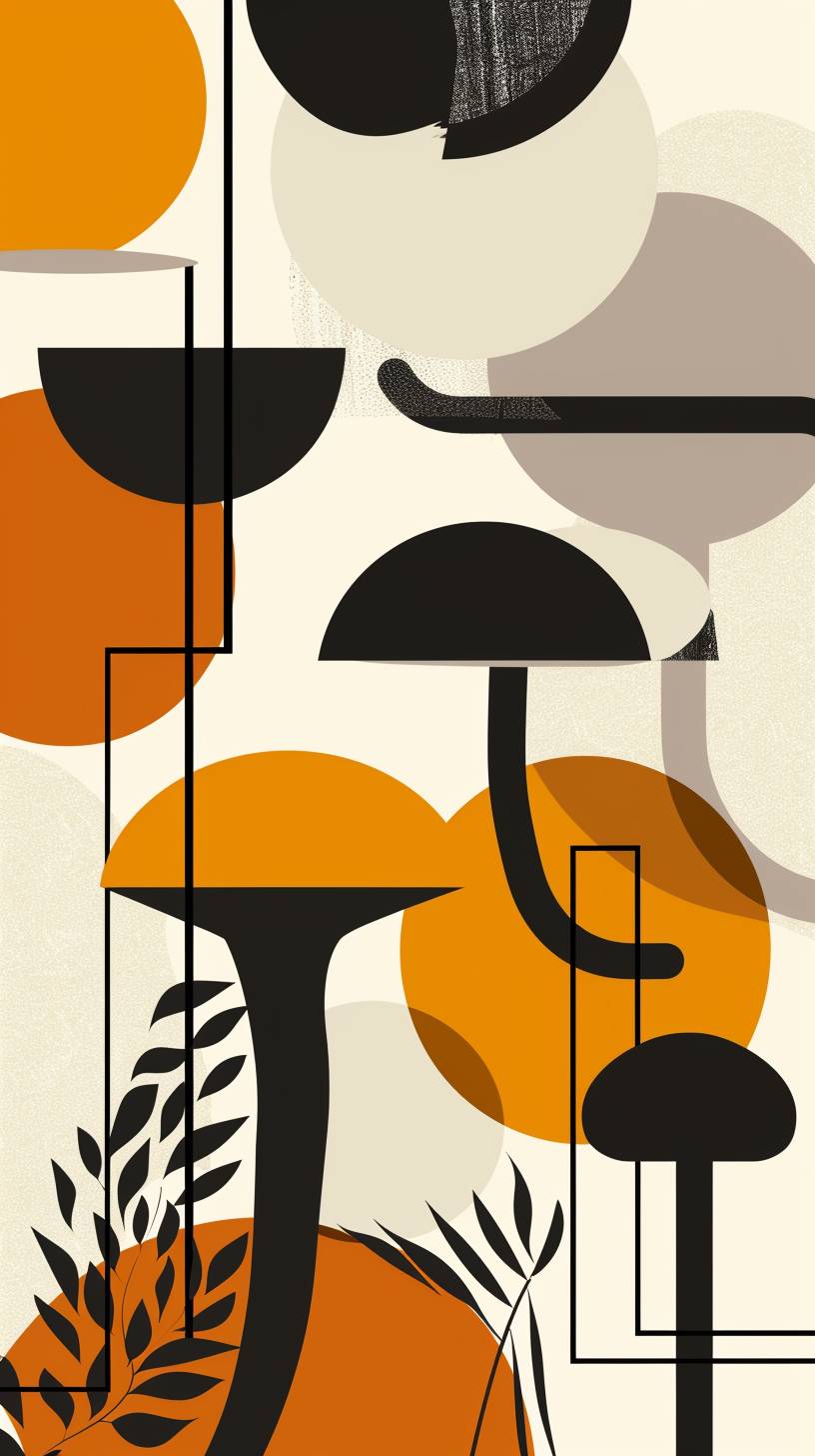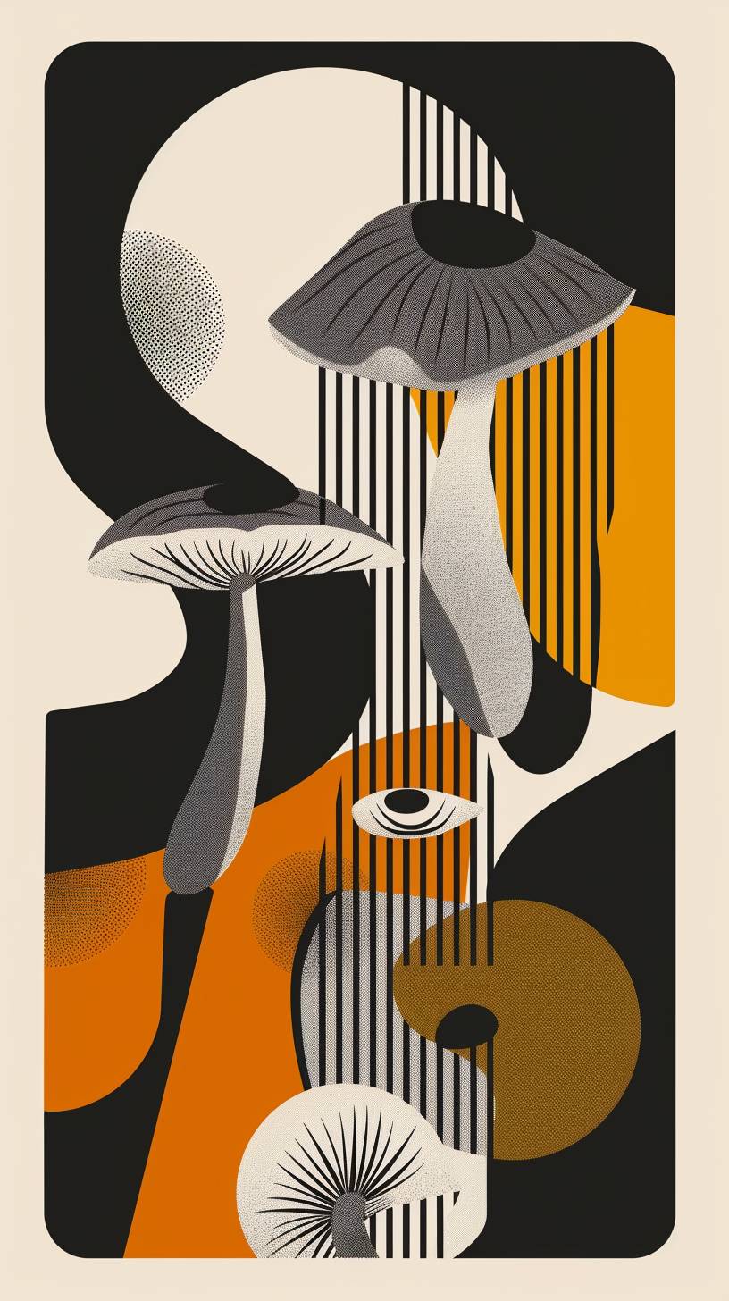 Абстрактный векторный графический дизайн с формами грибов, простыми геометрическими формами и толстыми линиями черного, белого, серого, бежевого, оранжевого и желтого цветов в духе постера.