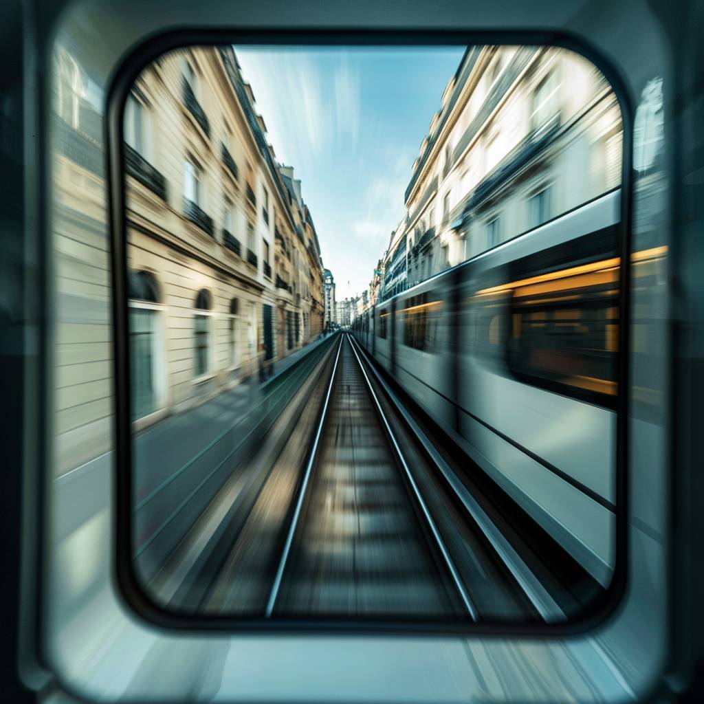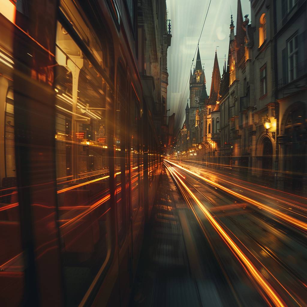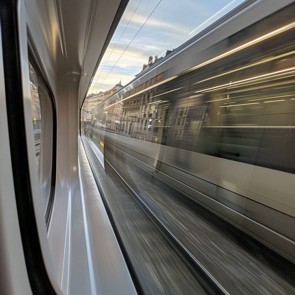 Внутренний вид гиперскоростного поезда в старом европейском городе.