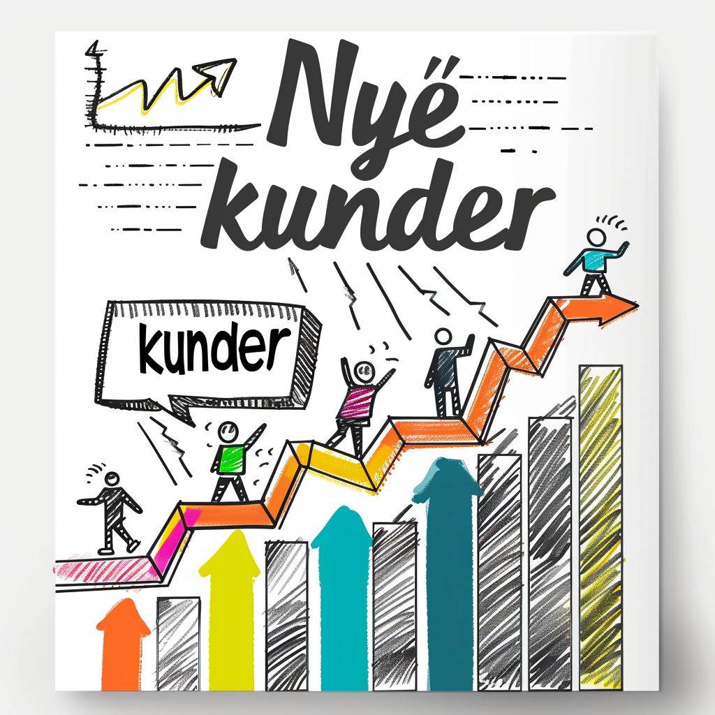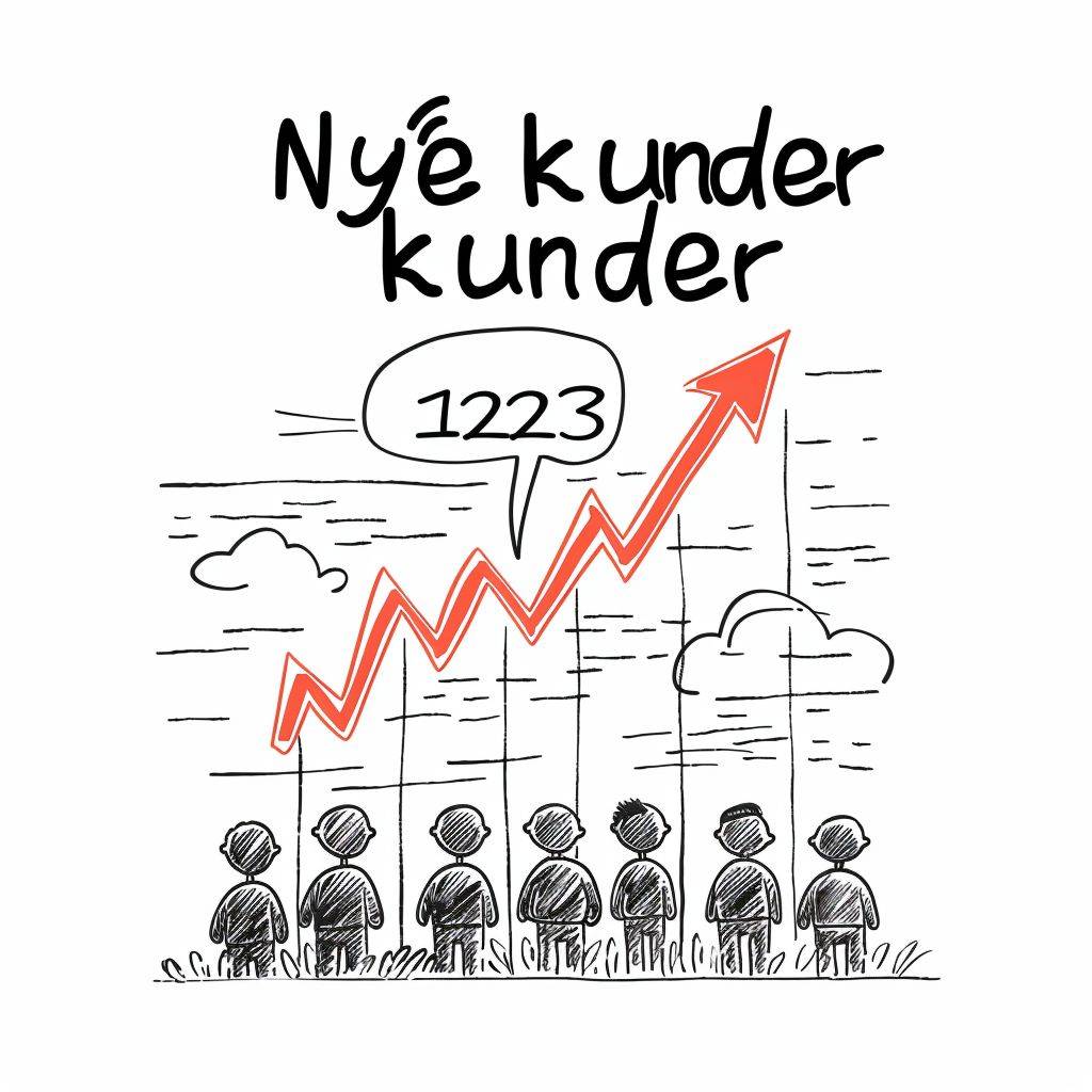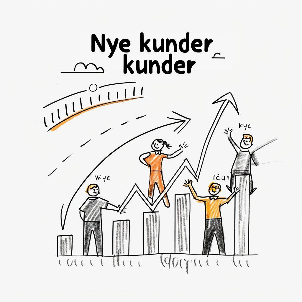 Create a black and white sketch with simple colors of a presentation slide highlighting the acquisition of new customers in 2023. The slide should feature a simplified illustration, such as rising arrows or figures representing people, to symbolize the increase in customers. Include the text "Nye kunder" in a sketch-style font at the top. The image should have a sketch-like, artistic quality on a white background, in a 16:9 format ideal for horizontal screens. --ar 1:1