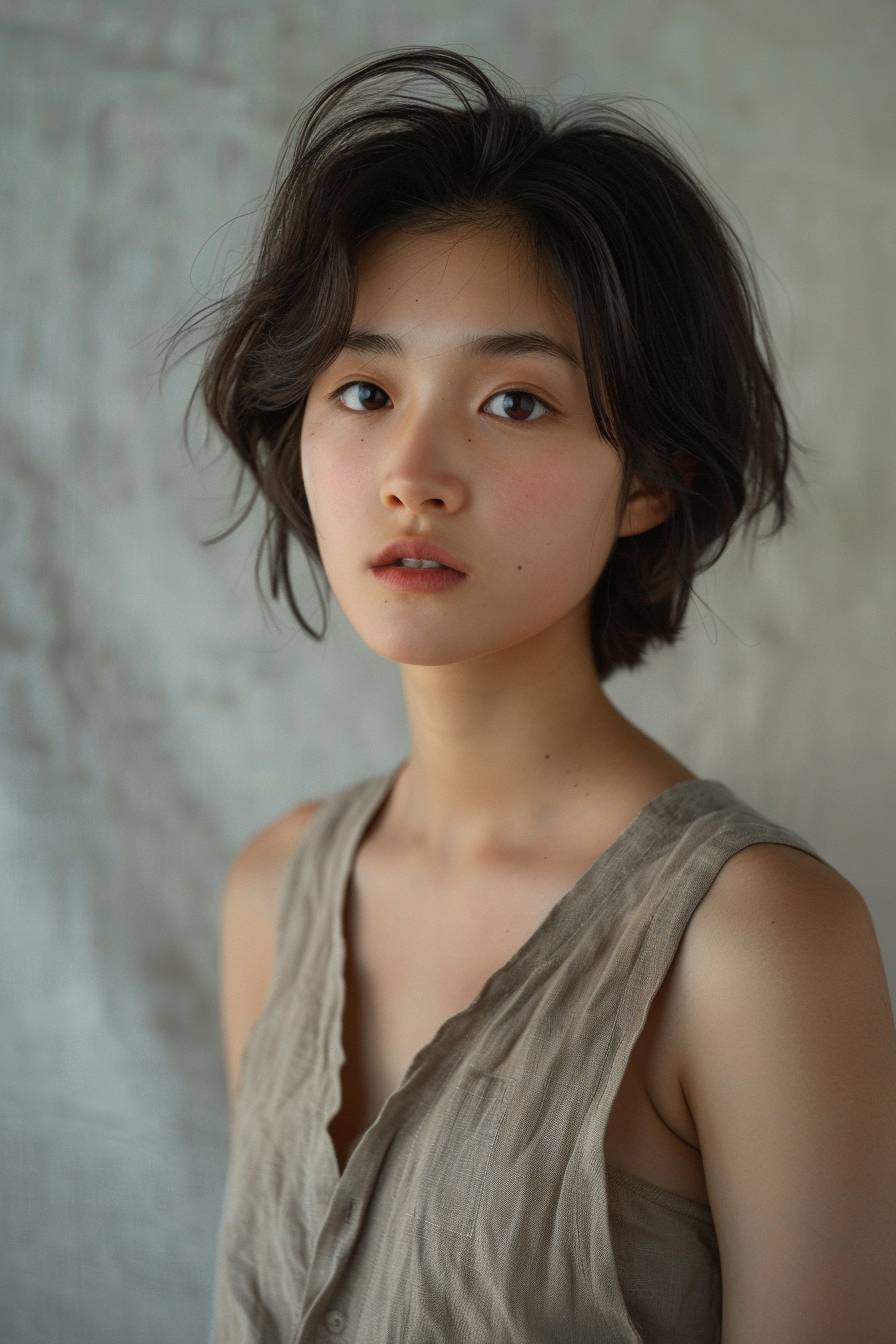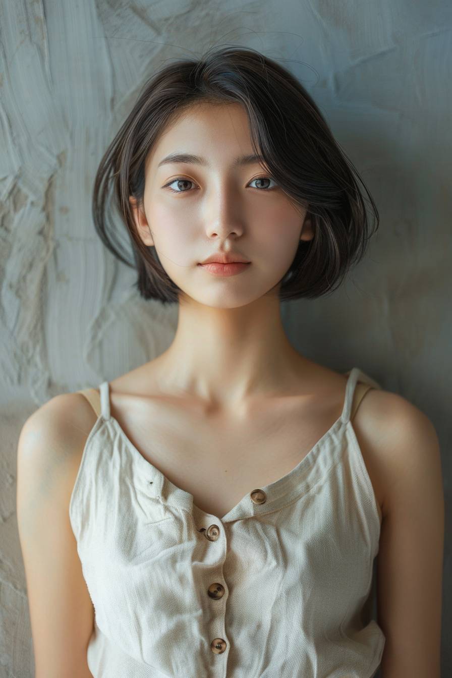 a asian young girl has short hair, wear linen clothes, the best fabric for summer wardrobe, front half-length photo, photorealistic 1.5 --ar 2:3 --v 6.0
