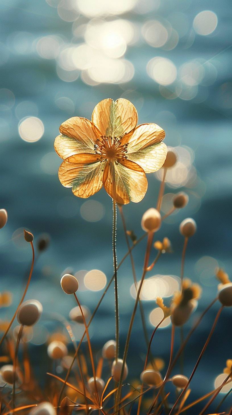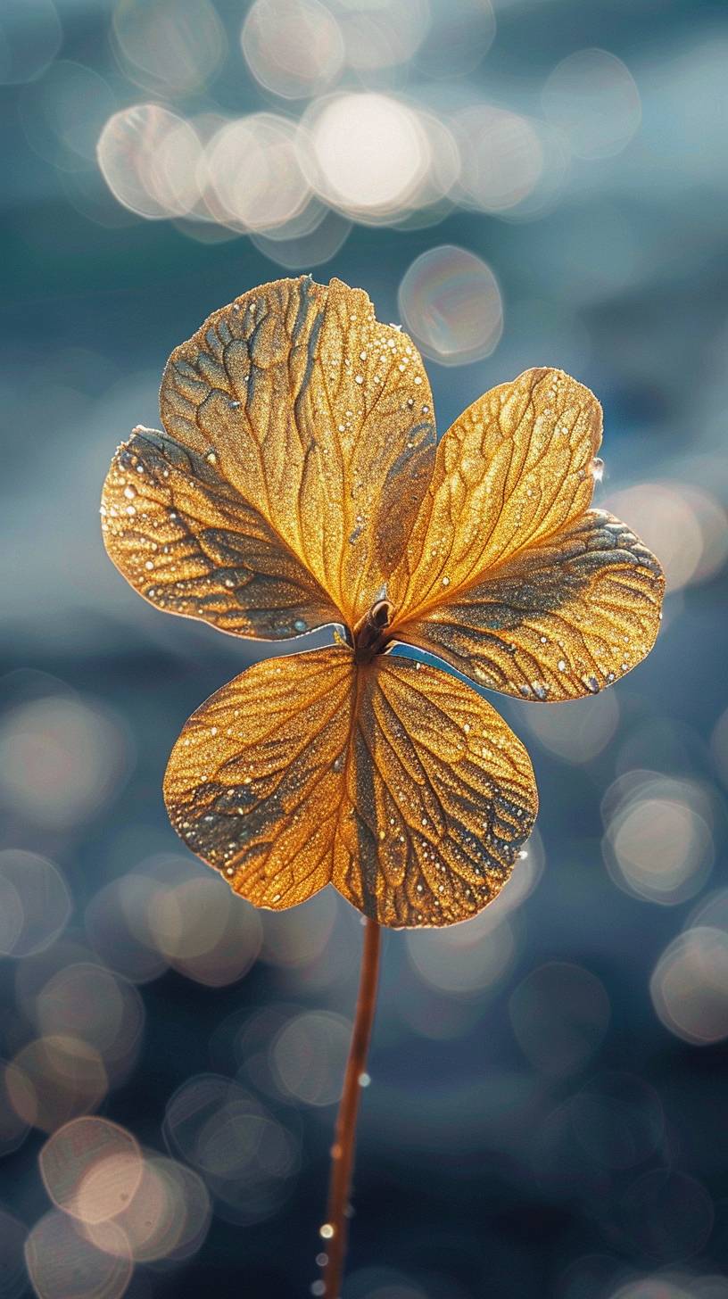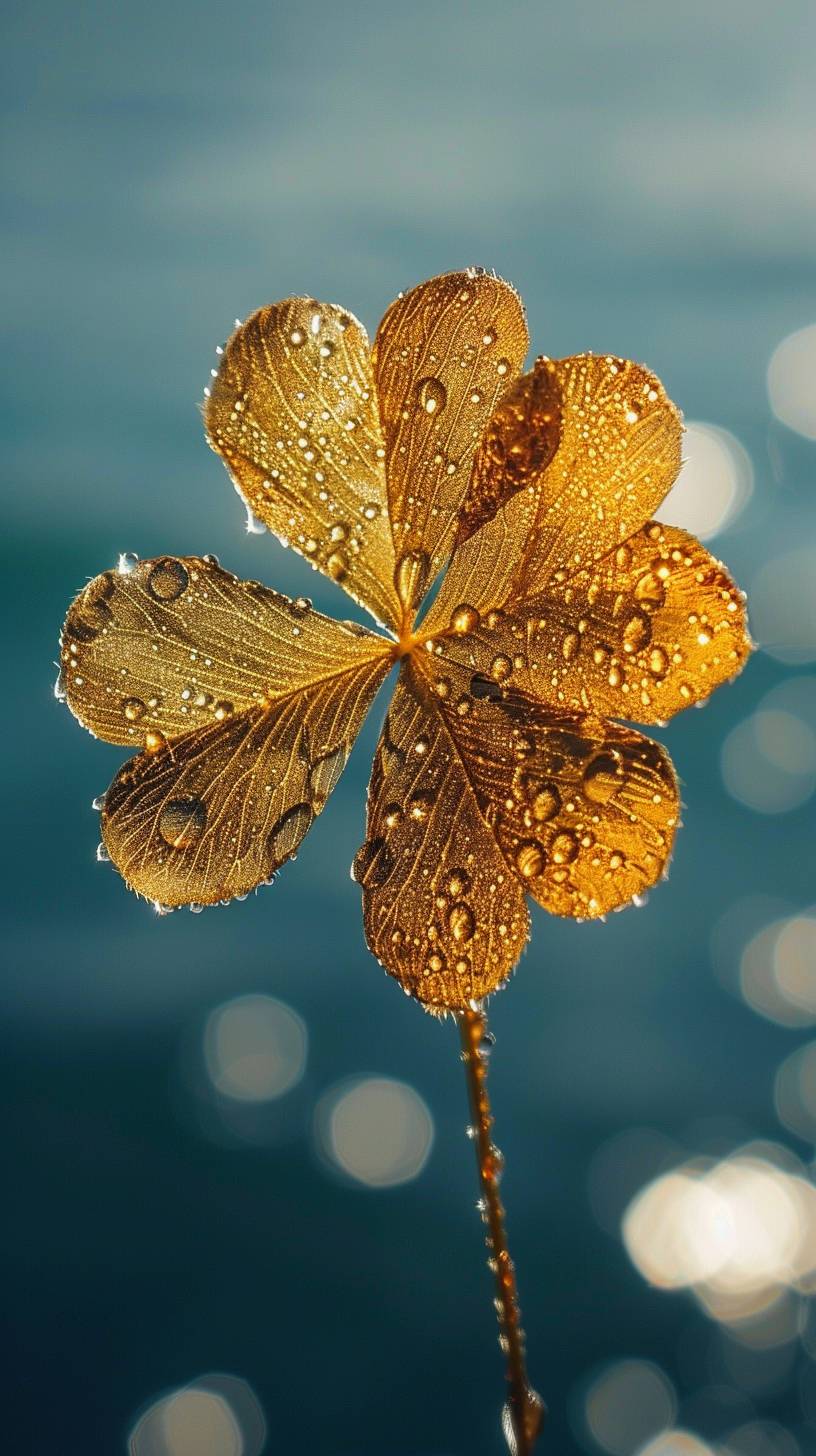 Золотой четырехлистный клевер, сверкающий на солнце на фоне синего океана