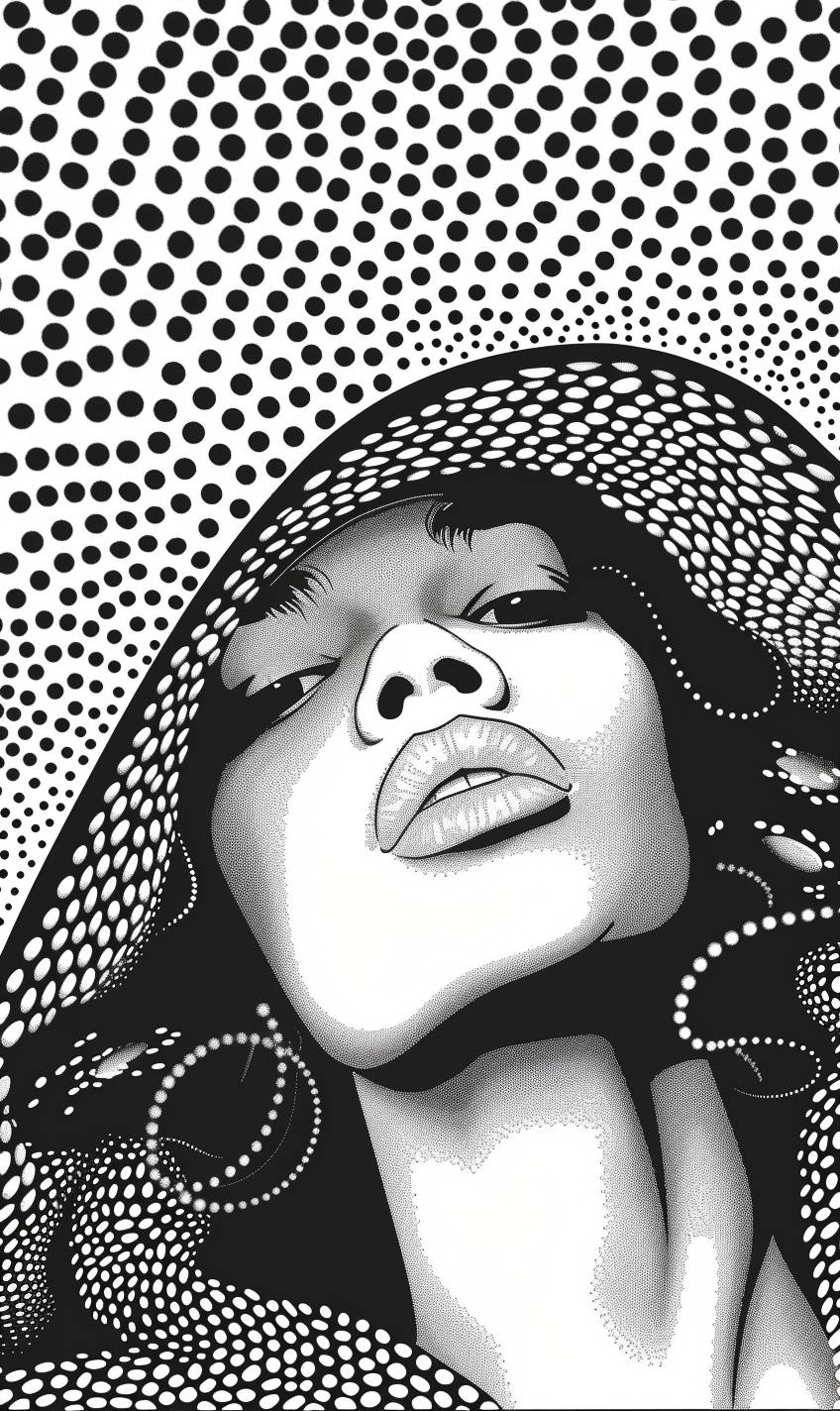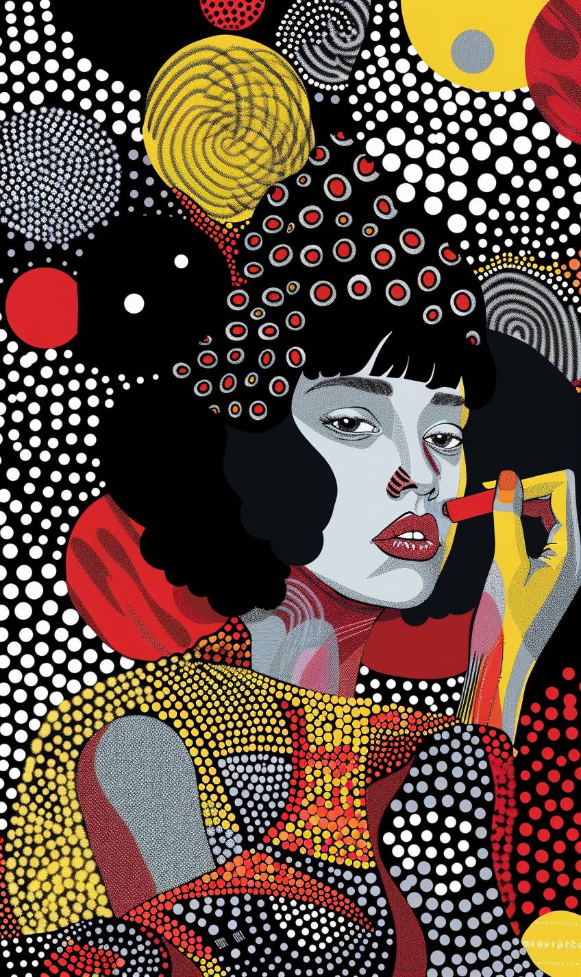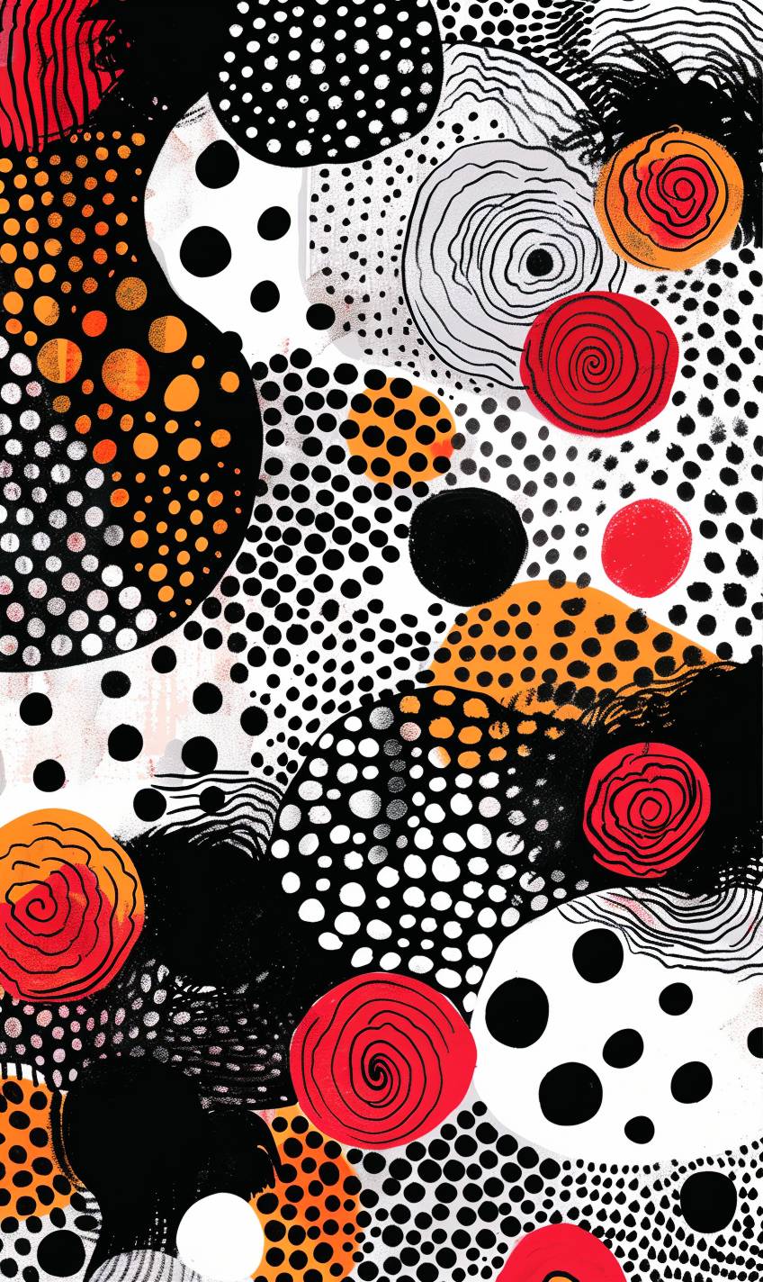 illustration for a notebbok in the avant-garde style of Yayoi Kusama, with polka dots, pointillism, cross-hatching, textures and patterns for a phone cover --ar 3:5 --v 6.0