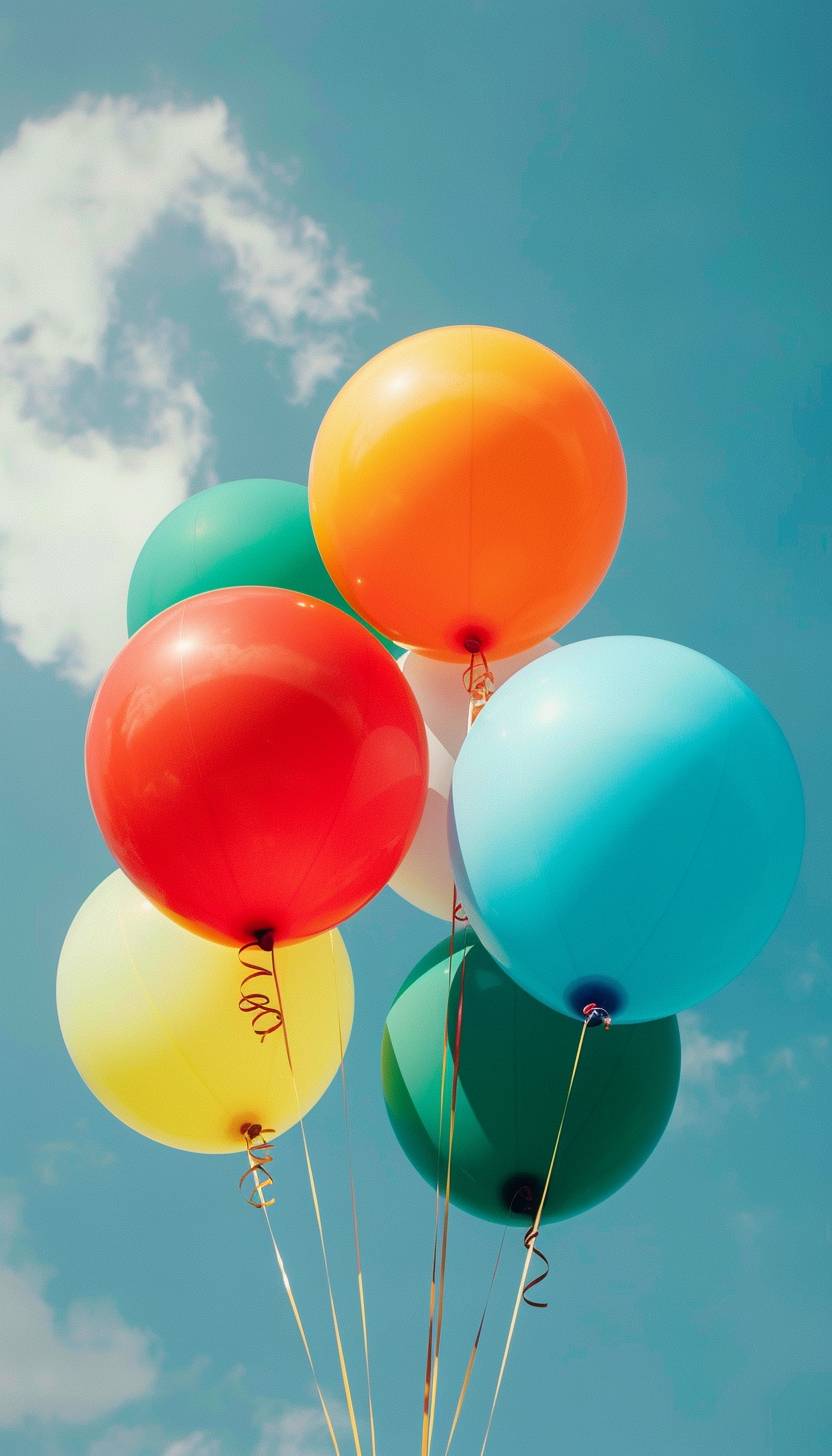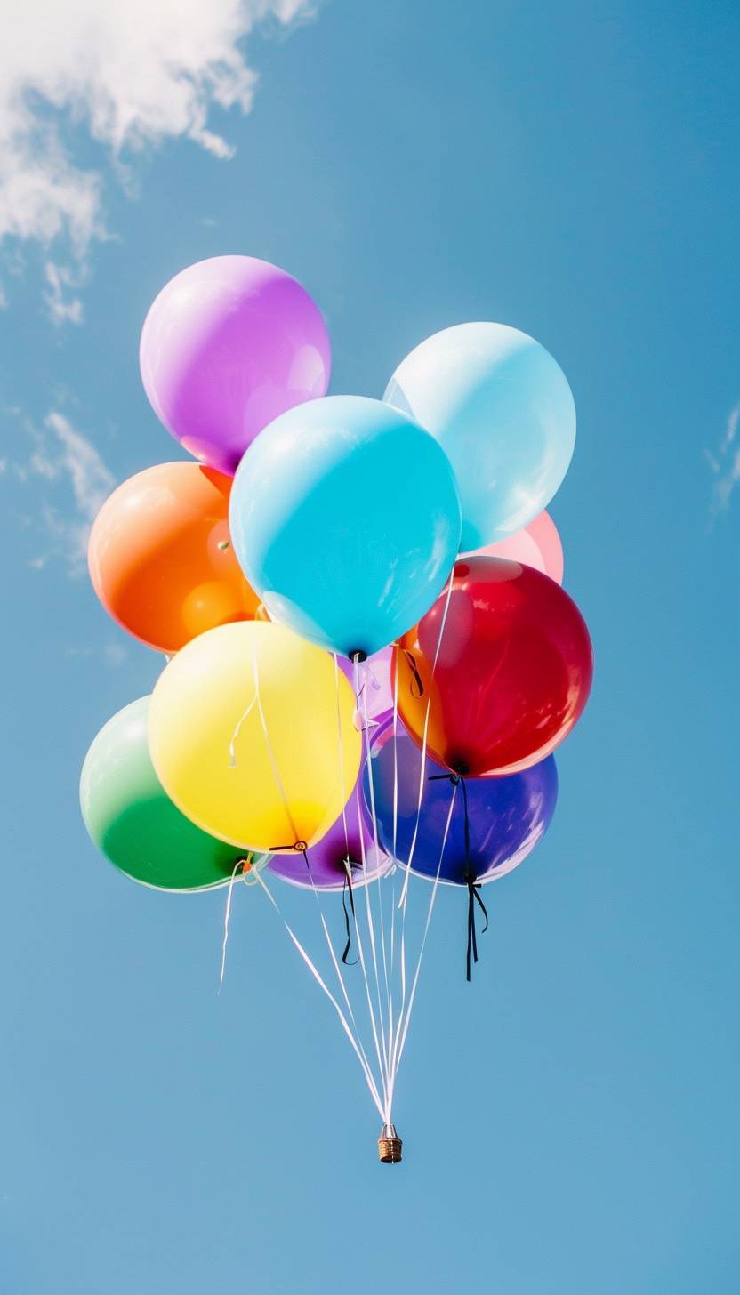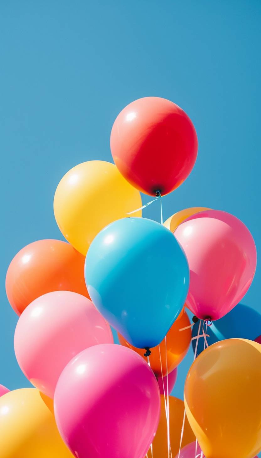 Цветные гелевые шары на фоне голубого неба, радостное праздничное настроение