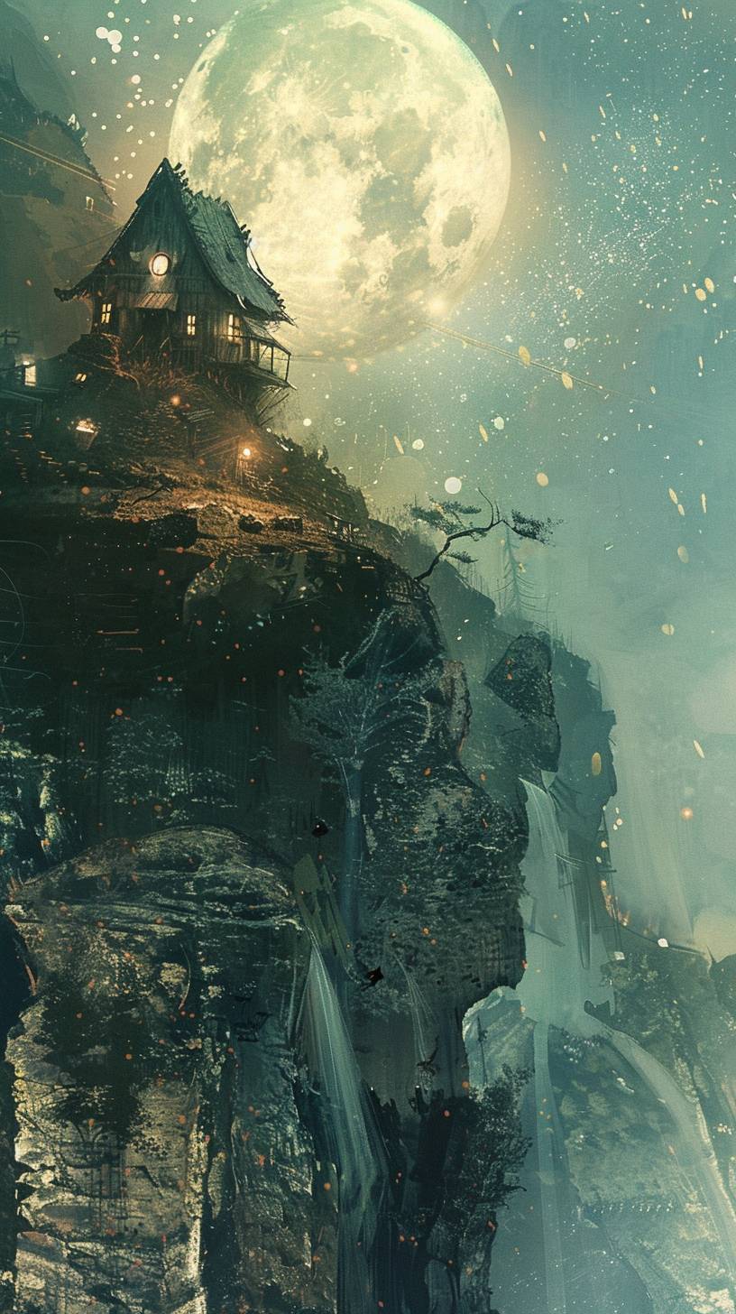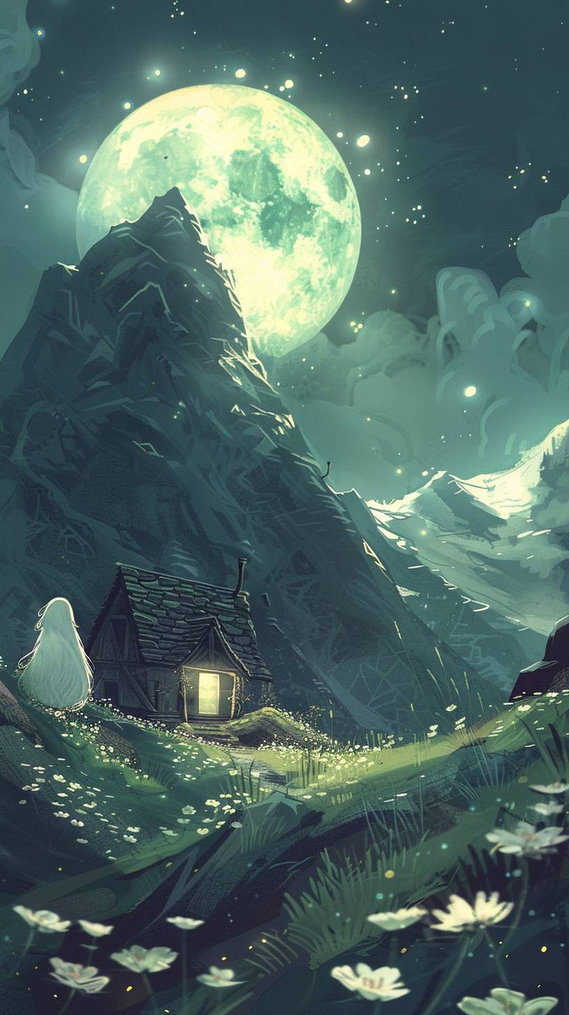 Сказочная иллюстрация для детей в стиле книжки про волшебство, изображающая горный ландшафт. На горе стоит скромный домик ведьмы. Небо сумрачное и звездное с огромной светящейся луной. Солнечный свет сверкает на траве на горе. Тонкая, хрупкая ведьма стоит перед своим домом с длинными белыми волосами. Атмосфера мистическая и мечтательная, с кремовыми цветами. Это в стиле Гибли с рваными линиями и множеством текстур. Иллюстрация выглядит так, как будто она была выполнена на текстурированном холсте.