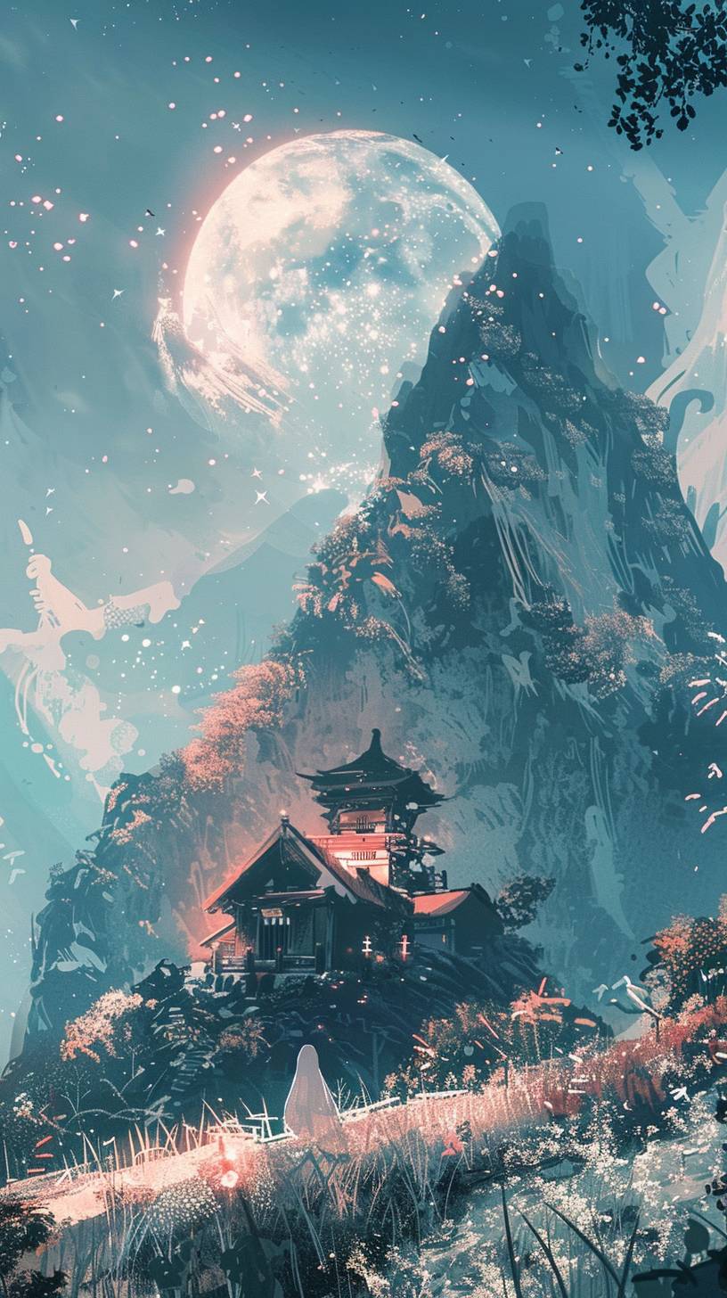 a whimsical storybook art style children's illustration of a mountain setting. On the mountain sits a humble witch's house. The sky is dusky and starry with an oversized glowing moon. The sunlight sparkles on the mountain grass. The thin frail witch is in front of her home with long white hair. The atmosphere is mystical and dreamlike with creamy colors. It's in the style of Ghibli with scratchy lines and lots of grungey texture. The illustration looks like it was done on textured canvas. --ar 9:16 --v 6.0